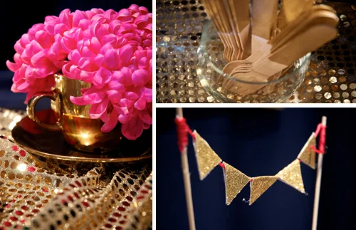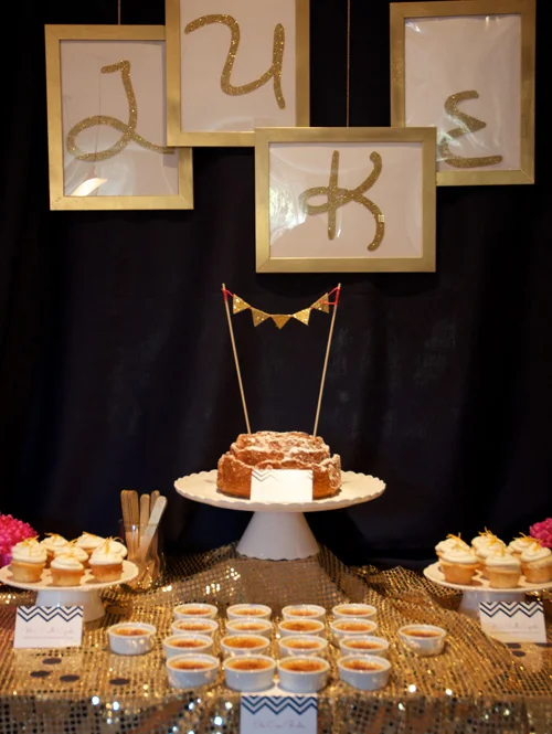 Ashley, who has just launched a party planning biz of her own – Ashley Lindzon Events – put a great deal of creativity and effort into the decor for this party. I was so impressed! The color scheme was so fitting and gorgeous: cobalt blue, fuschia pink, sparkling gold and bright white. The details included several DIY projects that Mandy and Ashley worked on such as gold doilies strung along the window, bunting for the bundt cake – no pun intended, gold dipped forks for the dessert table (love love love) and gold sparyed soup cans used as vases.