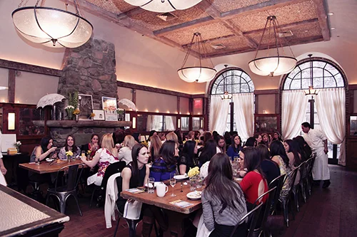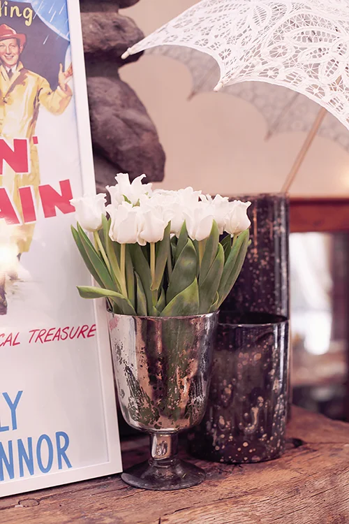 The private room at Locande Verde also features a stunning fireplace, which was perfect to introduce more decor elements. We framed vintage Singin in the Rain posters, one of which was the iconic lamp post scene. Clusters of white and bright yellow flowers in large mercury glass urns and hurricanes lined the mantel ledge.