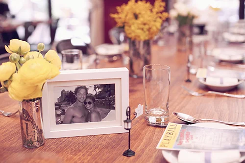 As guests entered the room, we wanted to have some sort of way for them to know which table they were seated at. So we created a board with a large photo of the couple and all guests names listed below. It was a great focal point as guests entered and also served a very important purpose! On the bar behind the seating board, we wanted to create a visually appealing entrance. Bright yellow Hunter Rain boots were the perfect vessel for creating a floral display. We set out another white lace umbrella and photos of the couple, to tie it all together.