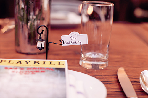 One of our absolute favorite elements of the tables were our menus. Locande usually prints menus on regular paper, and they would have been fine…but we had an even more fabulous idea. Check out these amazing Playbill inspired menus our girl Ali designed for us !! They were a perfect fit. And to tie it all together we found mini lamp post place cards for each guests name. The tables were gorgeous…if we do say so ourselves!