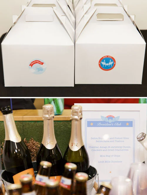 Terria created an Air Avi logo for our boxes and we had her make up a President’s Club sign for the menu so the guests knew what was inside of our gourmet boxes. We displayed these on a table right in front of the gym along side some prosecco, beers and sparkling sodas for the guests to help themselves.