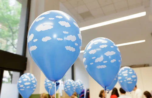 For the kids table we worked with Shop Sweet Lulu. We love their products as they have the best colors and patterns in paper goods. We also set the table with styrofoam airplanes and these cloud balloons tied to each chair so the kids could take them home on their way out.