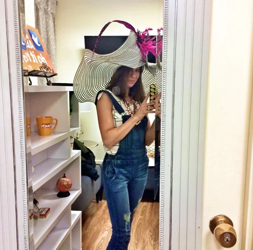 I arrived at the CBS Studio this morning at 6:30am. I was taken to the green room to change out of my overalls and into my Derby Dress. Had to try on my hat first things first…