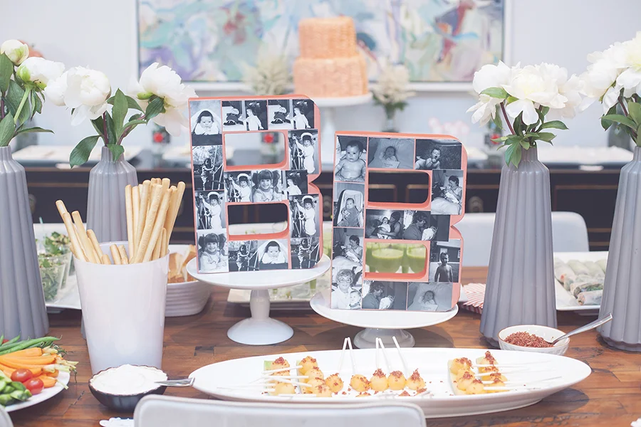 Beside the wooden letters were some of our favorite modern grey vases (from Ikea of course!!) filled with gorgeous white peonies. And then…the food spread! Thanks to our new friend Karen Ferries of The Cocktail Party Chef, the food was amazing, gorgeous and delicious! She had melon and bacon skewers, crudite with assorted dips, shrimp and veggie spring rolls with a peanut dipping sauce, fresh pea soup shooters, a mixed green salad and of course some yummy mini meatballs — my fave!