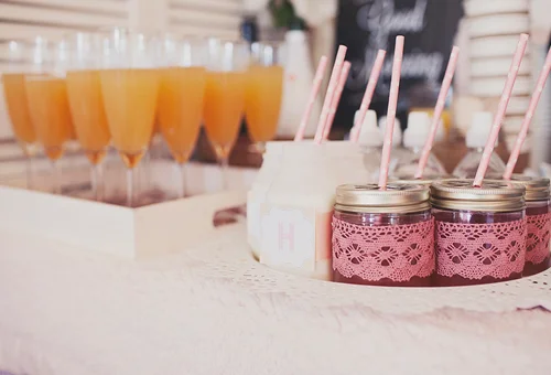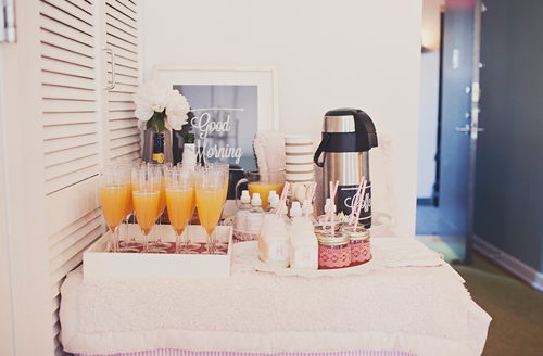 For the kids we served pink lemonade in mason jars that we decorated with lace. As well as milk in bottles that we styled with pretty pink satin ribbon. There was also lots of coffee and all the fixins for the guests to serve themselves on a table that we set to look like a bed…with a pillow and good morning sign!