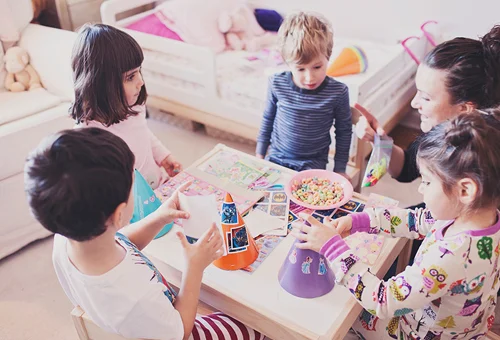Since there were a few kids in the age range of 4/5…we had to think of something to keep them busy and entertained during this leisurely brunch. So we set up a table in Mazzy’s room for them to make necklaces out of fruit loops and decorate party hats with stickers both from our favorite store Party City. The kids had a great time crafting, eating and then climbing in and out of Harlow’s crib…
