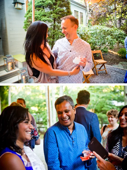Since Klaus & Waseem’s home in Sag Harbor is on a slope of trees leading down to a pond we wanted to create an area where the guests could hang out at their leisure with drinks and food. We set up a tent in the front of their home to do this. We put the bar underneath as well as chairs and cocktail tables in rustic wood with white linens and the most fabulous runners from Saffron Marigold.