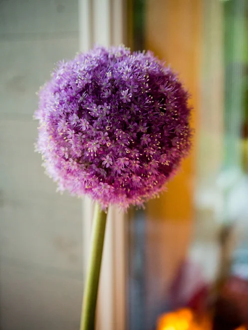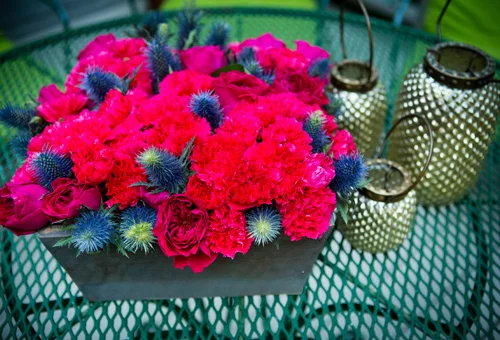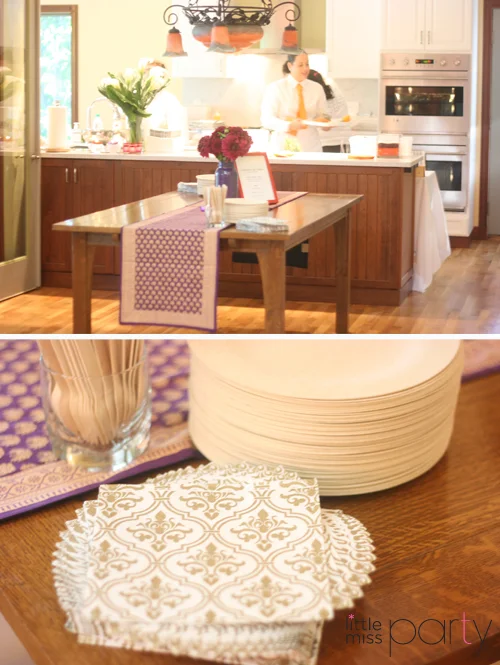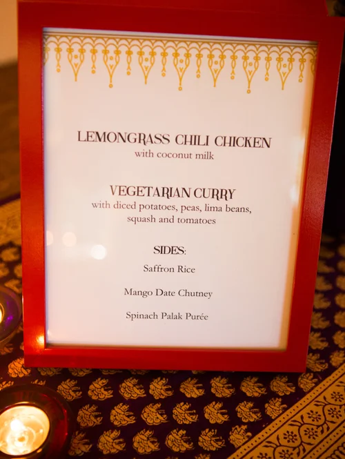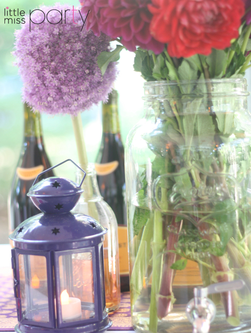 For décor we set up small but meaningful details throughout. We set electric tea lights in lanterns filled with lentils, used bamboo plates and gold damask napkins for dinner, lined wood trays with purple gum balls for dessert, and placed tea light holders next to bright colored flowers in bud vases. Our favorite look to this party were the globe lights strung through the trees in the backyard and the red lanterns hanging in the tent out front.