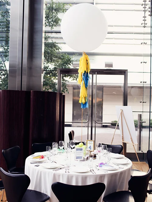 Michael loves tennis. So we took his passion for this game and built it into the decor by filling cylinders with tennis balls and using them as anchors for 3 foot balloons on each table.