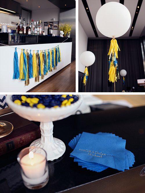 We worked with the Flair Exchange on tissue tassel to hang from each balloon in the Emory College colors. Carmen from the Flair Exchange also made us bunting to hang from the bar where we set out personalized napkins from For Your Partynext to some blue and yellow M&M’s. Always a fun touch!