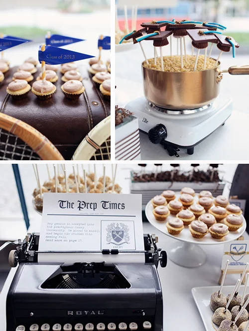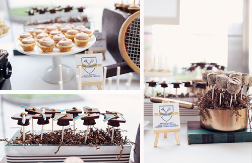 As for dessert…it was tough to hold back. We found the most fabulous vintage tennis racquets on Ebay and set them up against a symbolic piece of luggage. In addition to the tennis theme we tried to remember back to our college days (ouch) and think of what our dorm room was made up of. Well I remember eating a lot of mac n cheese on my single burner hot plate. Ha! So we used this as inspiration to display desserts made by Kreated by K.