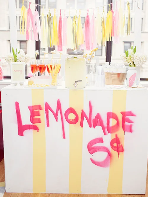 We have our very own Ali to thank for this ridiculously awesome lemonade stand that her handy boyfriend built for us…which we dolled up with lemonade colored tissue tassel garland from The Paper Jar on Etsy!