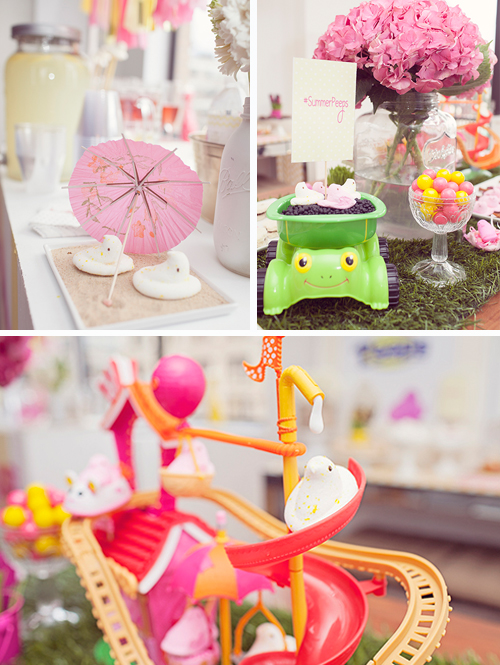 So check it out…ya know those adorable marshmallow chicks that hit the stores around Easter time every year…Peeps?! Well they are hitting the streets hard in all different shapes and colors for more then just the spring holidays and they are cuter then ever! You can find them in purple chicks, blue bunnies, white & red hearts for Valentines day (which we used for our friend Jen’s 40th!), ghosts for halloween…and their latest launch…summer flavors Lemonade and Bubblegum! We were lucky enough to partner up with our all time favorite blogger Mommy Shorts AGAIN and throw a party for these new summer Peeps and had the best time doing it!