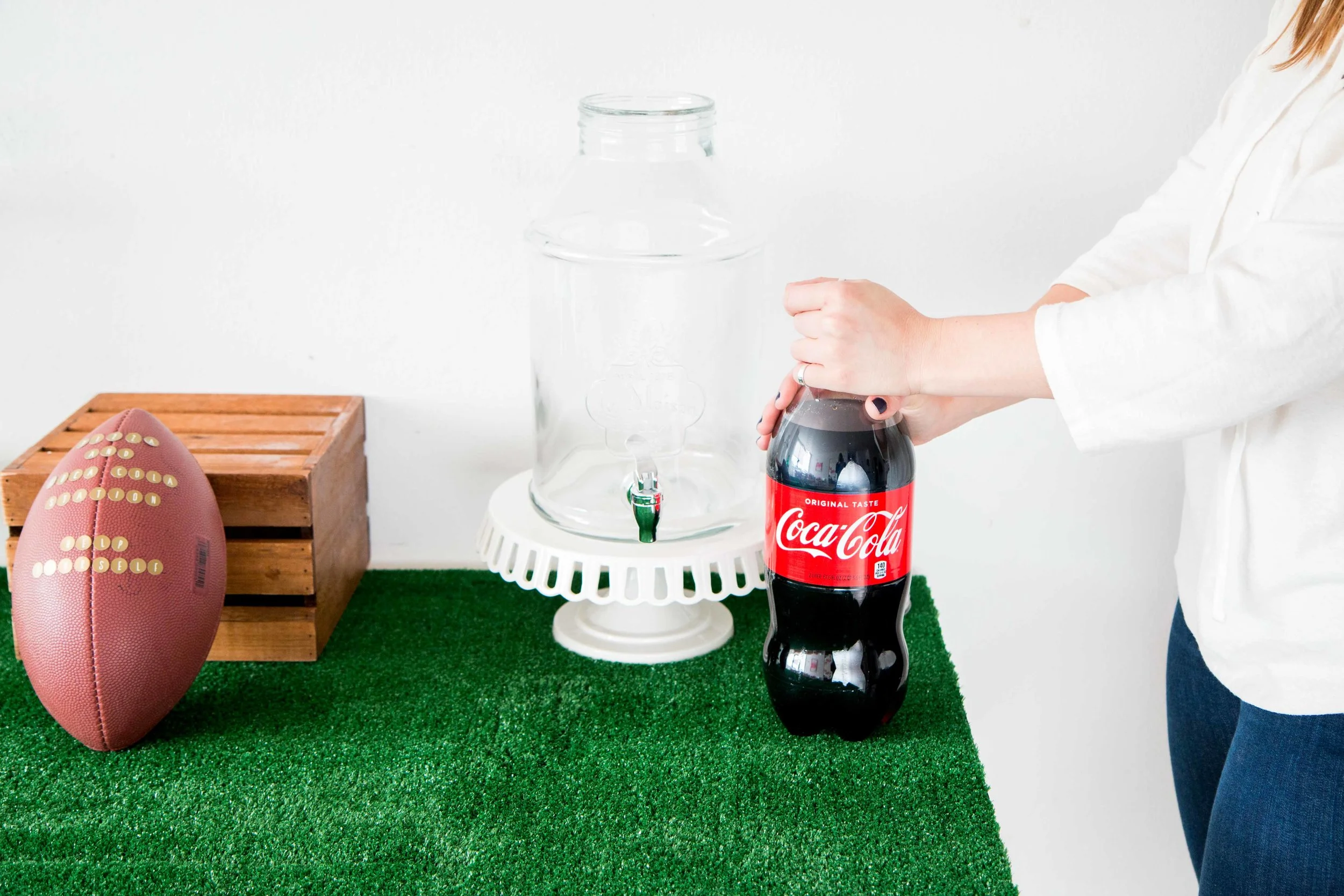 With our food and drinks selected, Maggie got to work decorating the table. First, she lined the table with astro turf so the table resembled a football field. For our soda bar, she set out cake stands to act as risers for two glass beverage dispensers, which we used to serve the Sprite® and Coca-Cola®… just like a soda fountain! We repurposed the old soda bottles and used them as vases for flowers and placed them next to each beverage dispenser, so that the guests would know what type of Coca-Cola® beverage was in each dispenser.