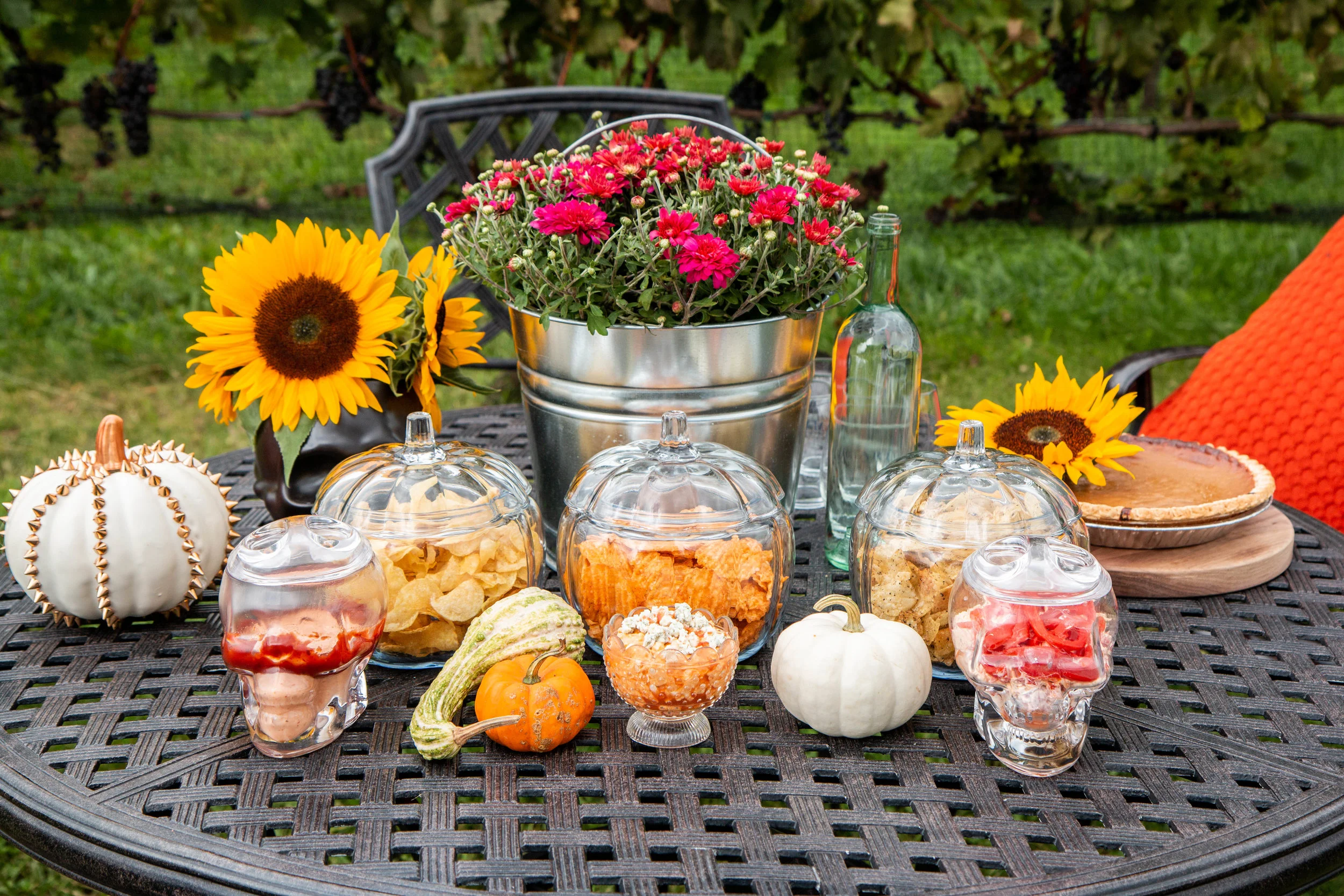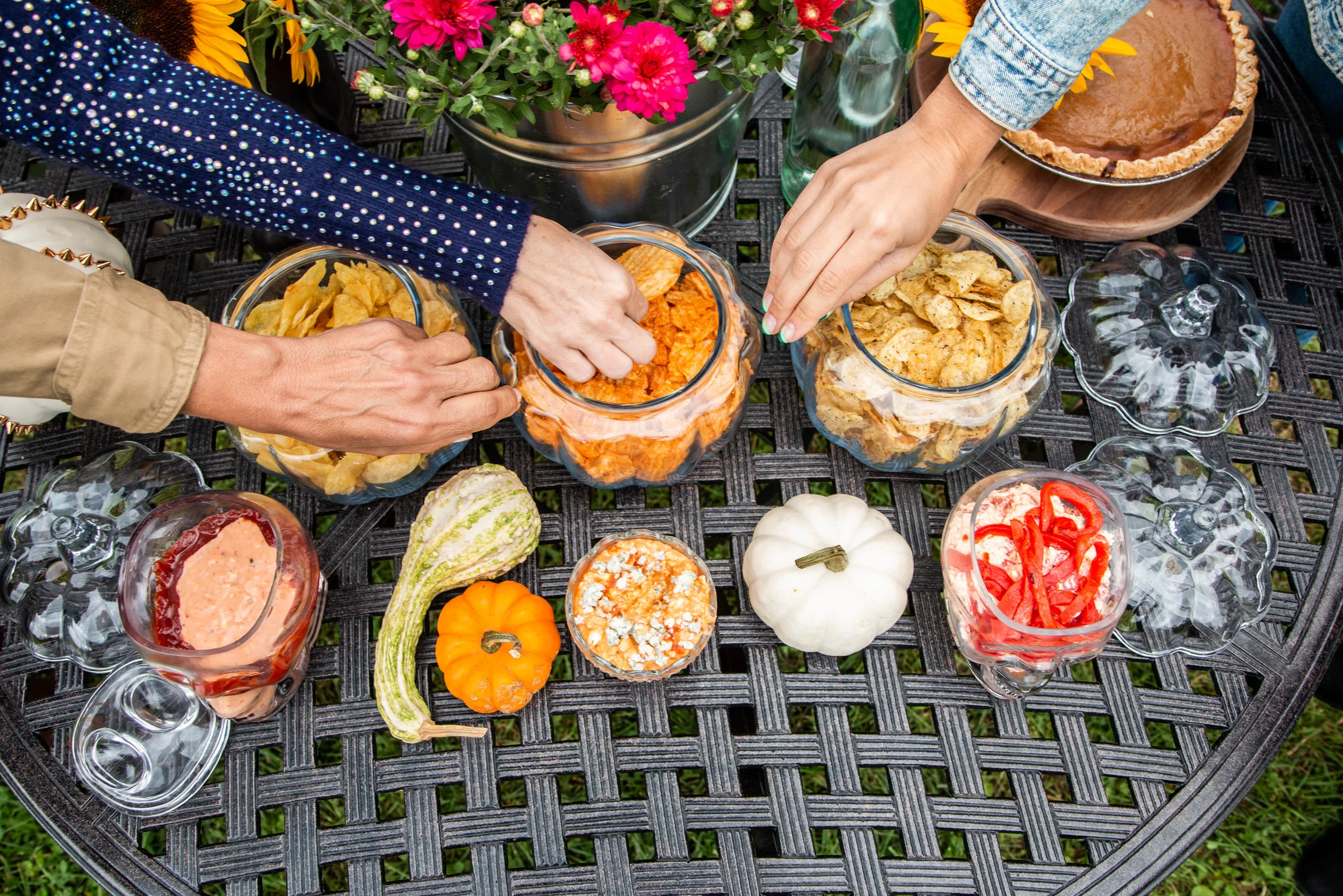 We find it’s the little touches, like topping the pie with a sunflower, that make the table feel so special. We filled in all the extra space with cozy pillows, glass pumpkins and skull jars to use for our Kettle Brand chips and original flavored dips.