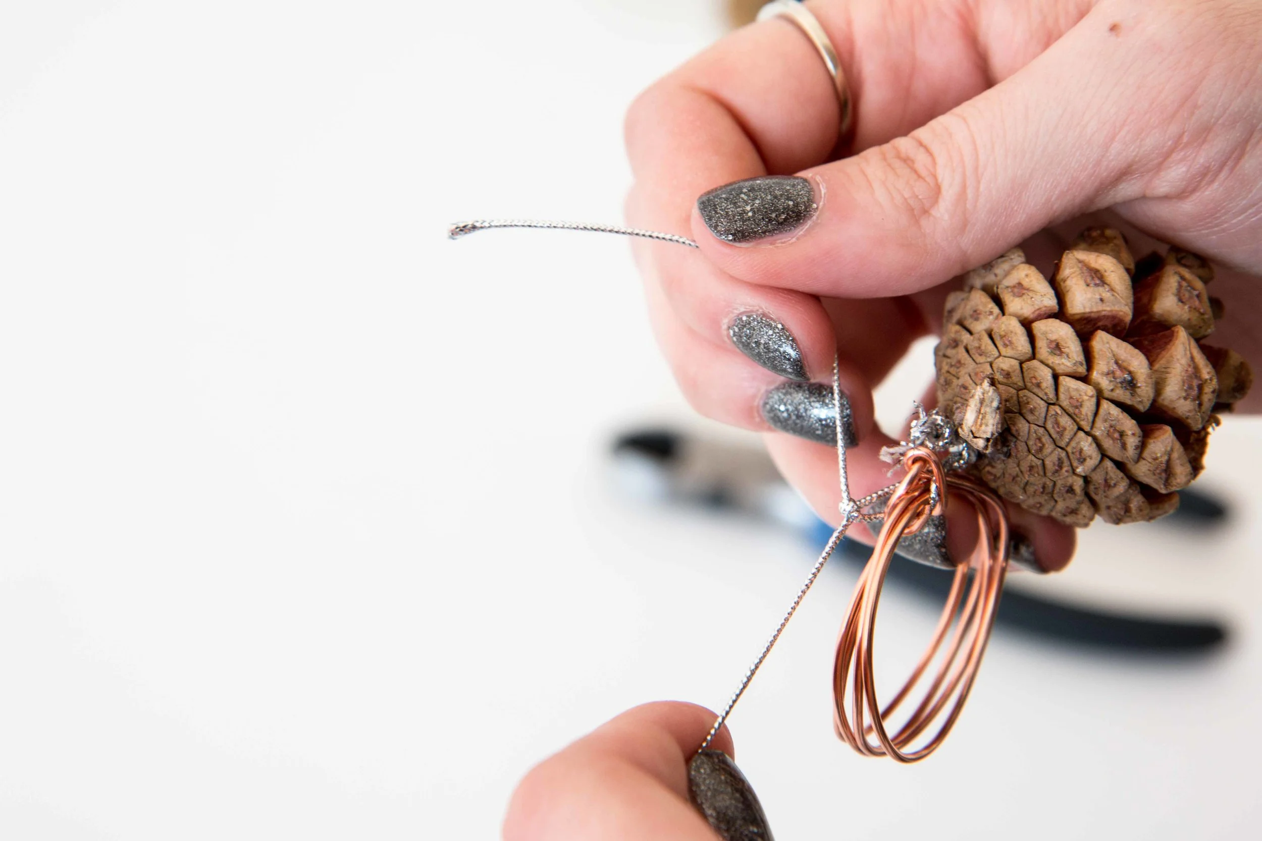 Step 4: Take your pinecone ornament and wrap the strings through the hole of the wire. Tie it tightly and knot it.