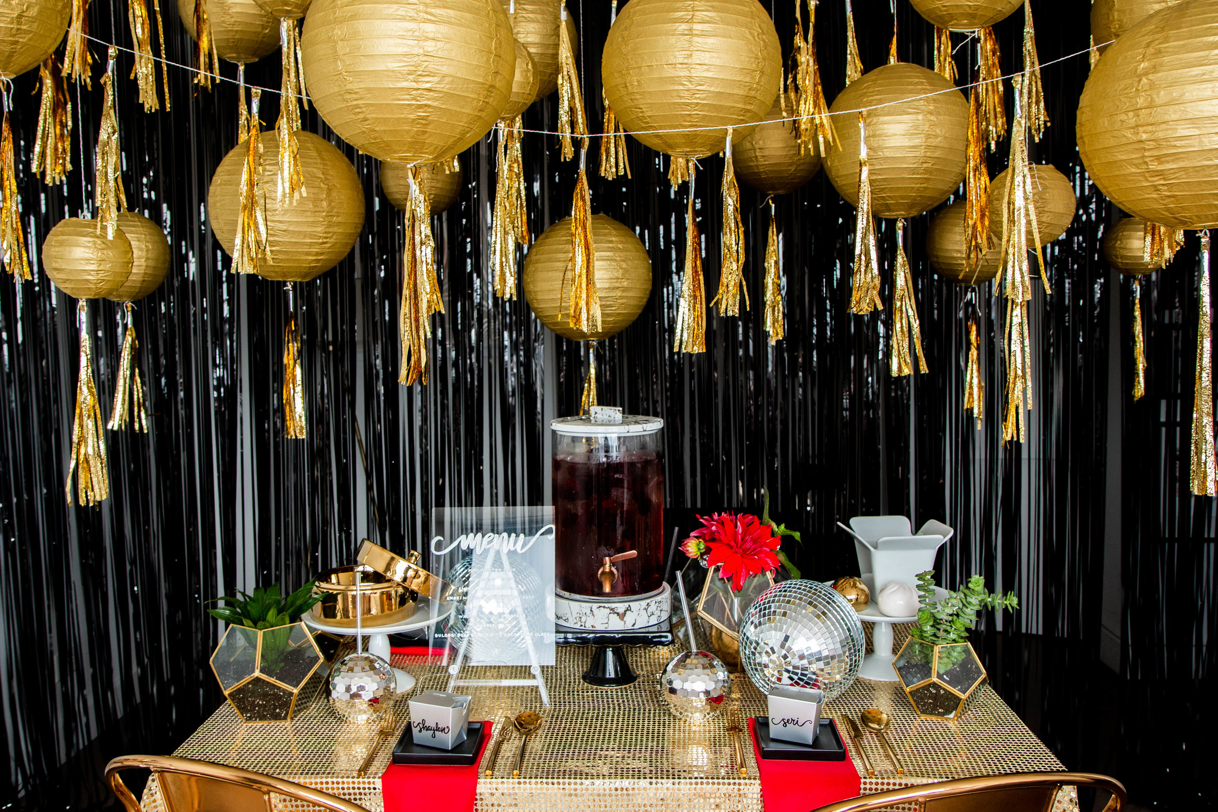 Maggie of course got all crafty with the menu hand writing the whole thing on an acrylic frame. Natalie found silver Chinese food take out cartons and Maggie used her calligraphy magic to write each guest’s name on a carton as their place card for each table setting.