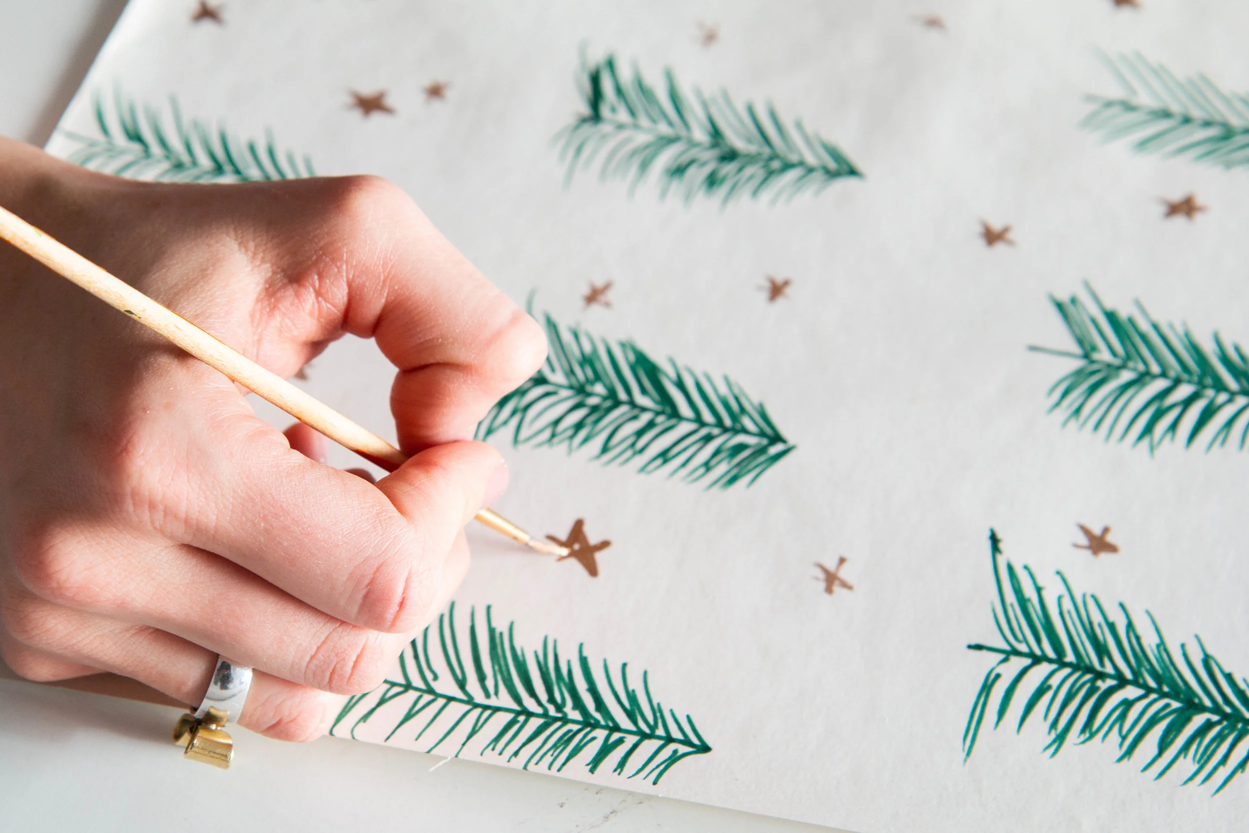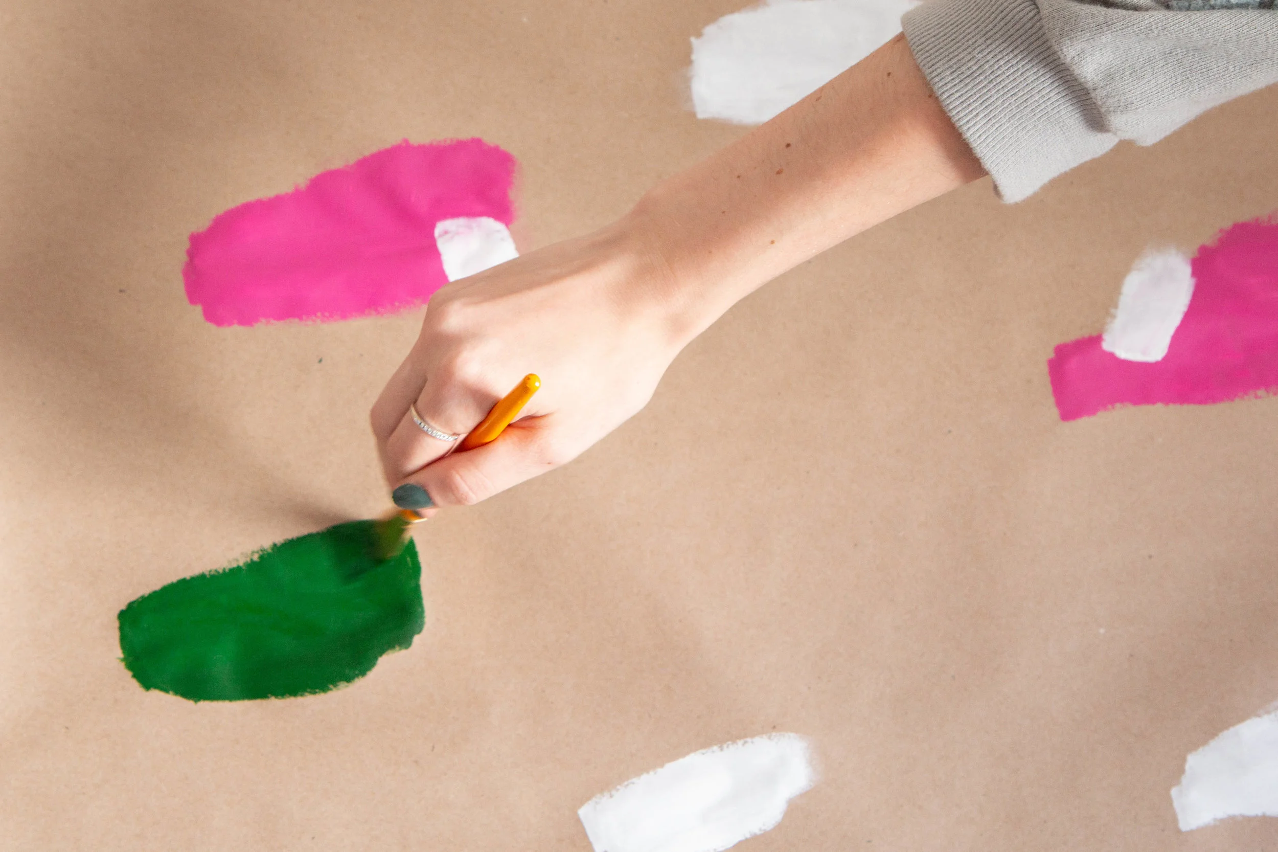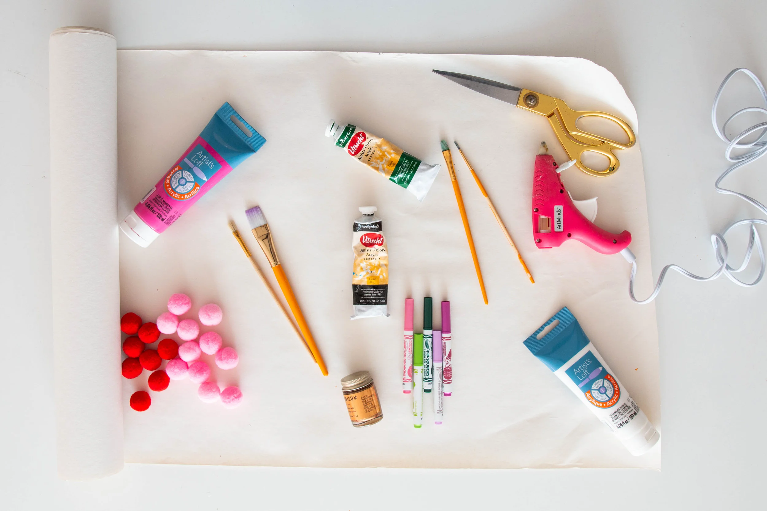 The great thing about this DIY is the simplicity. It requires so few materials, and all those materials are up to you. We encourage you to get creative with any supplies you might have at home. We bought absolutely nothing for this project. We gathered up paints in our party color scheme, found some brushes, scrounged up pom poms, chose some markers, and broke out the hot glue gun. The main thing you will need for this project is a roll of paper. We used a roll of white paper and large roll of kraft paper, which we keep on hand in the office at all times. This way, we could measure the amount we needed for a gift before committing to the amount we would create.