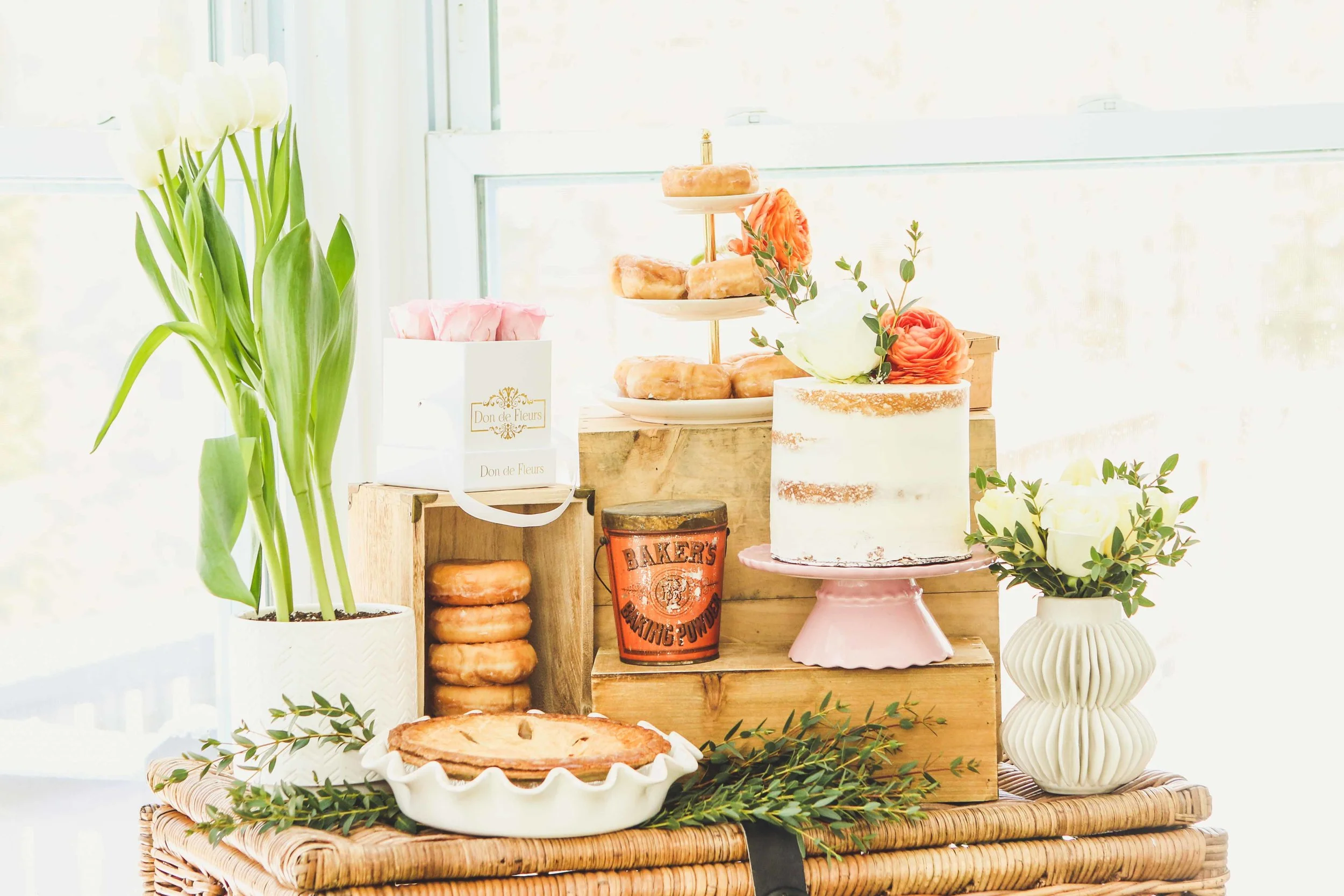 We moved onto the table of desserts, which hit the spot for my sweet tooth. We served a buttercream frosted, naked cake which we topped with more flowers and greenery to bring it to life. We also provided glazed donuts, an apple pie, and white chocolate bark made to match the color scheme perfectly. Our taste buds were going wild with the combination of our deliciously bitter Lillet spritzer and our simple sweets. We couldn’t have finished off this meal in any better way!