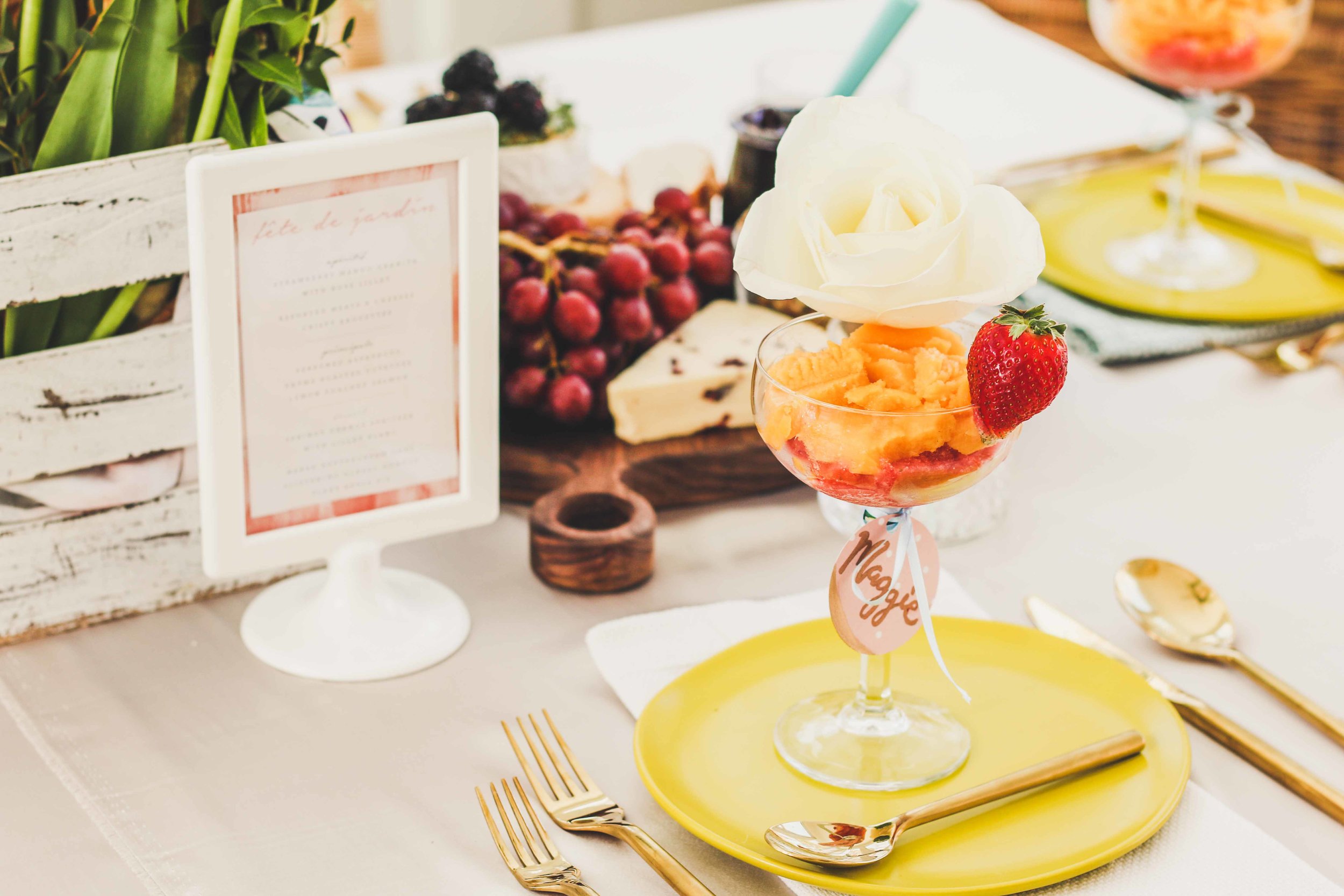 And now for the best part- THE PARTY! We started out with simple a simple assortment of meats, cheeses, and bread to follow our first Lillet apertif. When everyone came in, they found their name on a tag attached to a coupe glass, which Natalie decorated with a rose and ribbon. Each glass was filled with a Lillet Rose Granita. Everyone dove into their granita before nibbling on the small bites, waiting patiently for the main meal to be ready. This is exactly how we made our Mango Strawberry granita with Lillet.