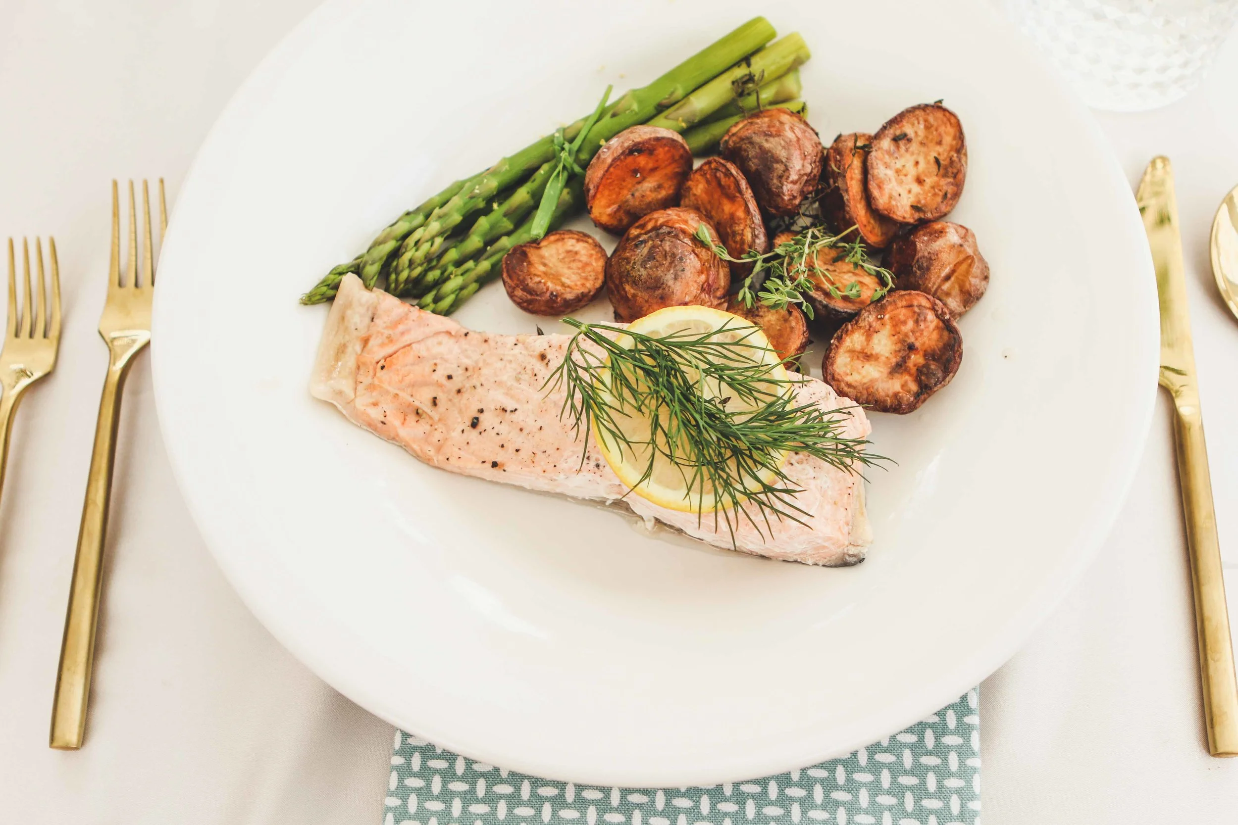 Seri finished prepping our rosemary roasted potatoes, seasoned asparagus, and lemon dill poached salmon just in time for Abby to finish handing out our second cocktail. The Lillet Blanc Spritzer was a huge hit paired with our springy meal. Everything you need to know for this drink is listed here: