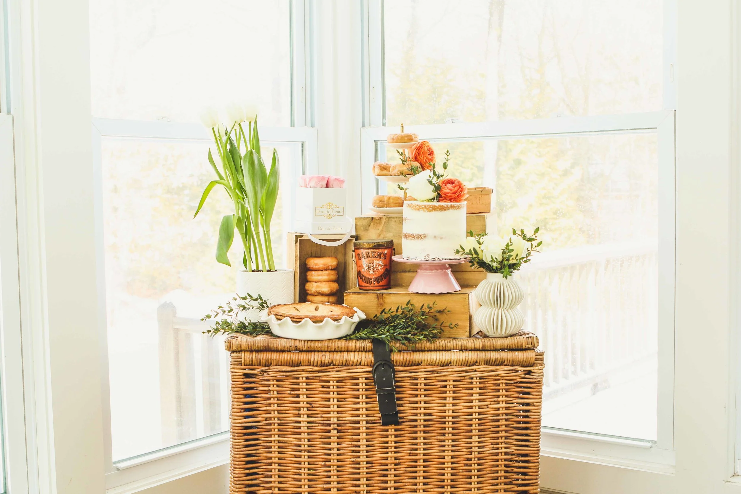 The lively feel of the room is largely due to all the beautiful fresh greens and flowers. Before this shoot, I went to the flower market in New York City to pick up all the greenery, French Tulips, and roses. We even picked up some potted tulips that Seri can keep through the whole season in her brand new set of beautiful pots. We utilized the plant life by placing it in spots all over the room. We used all our greenery and flowers to fill the bike basket, plump up our chandelier, prop up the baguettes and Lillet in the centerpiece basket, and even had it poking around our dessert table. With our leftover tulips, we transformed an empty bottle of Lillet into a vase; this is such an easy and beautiful way to display flowers.
