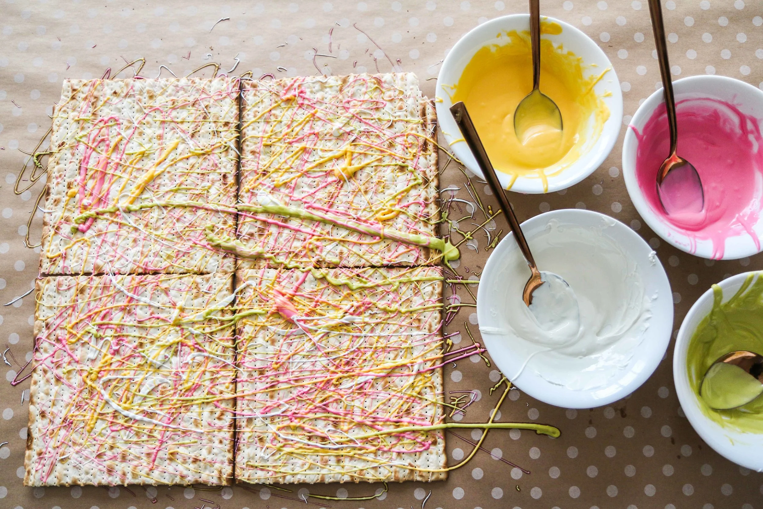 Grab a few bowls, fill with chocolate melts in different colors (I am always able to find these at Bulk Barn in Toronto but they also sell them on Amazon; Melt on high for 30 second intervals, stirring in between until melted. Cover a flat service in kraft paper, add a baking sheet or tray, cover with wax paper, add whole pieces of Matzo, and START TO SPLATTER.