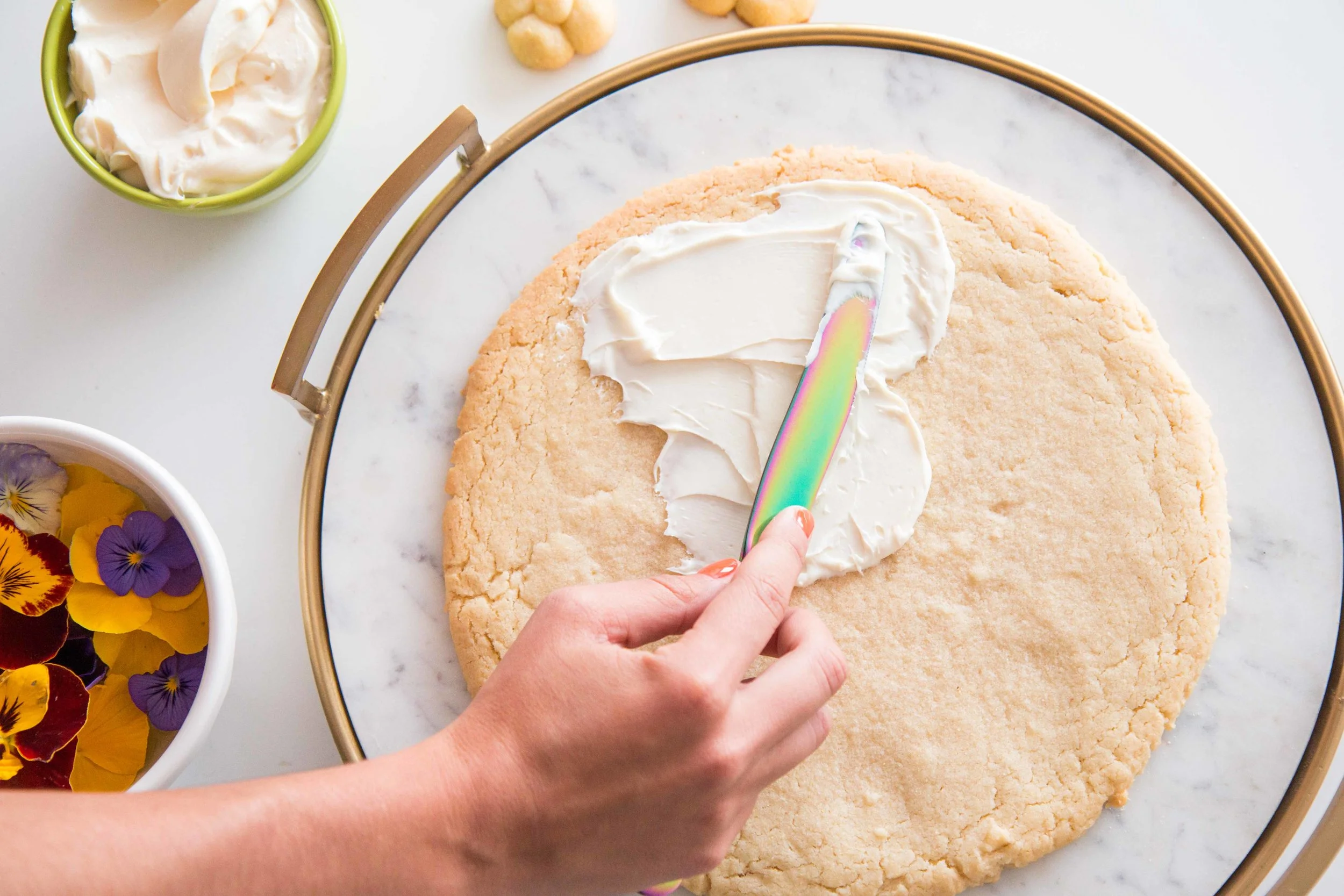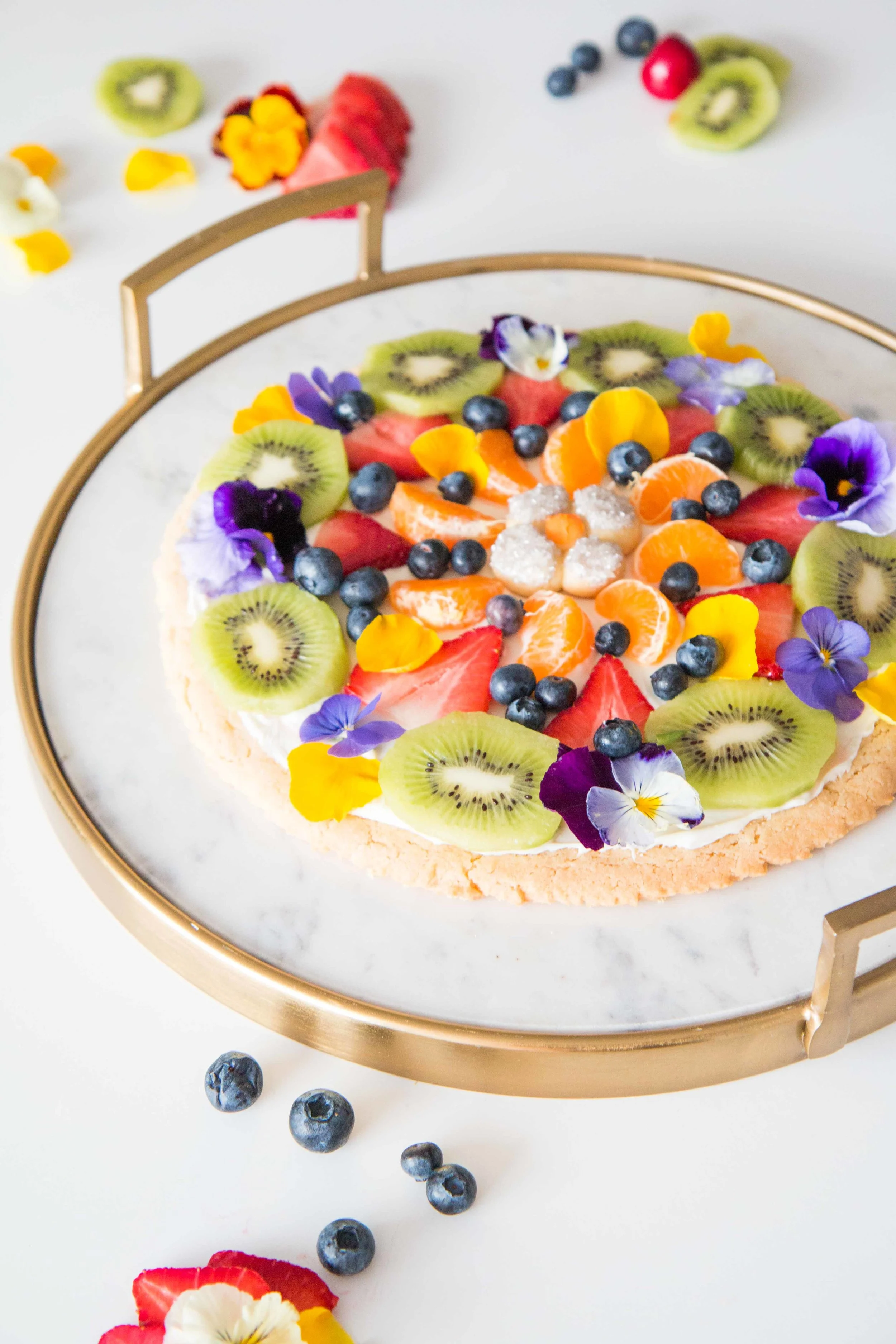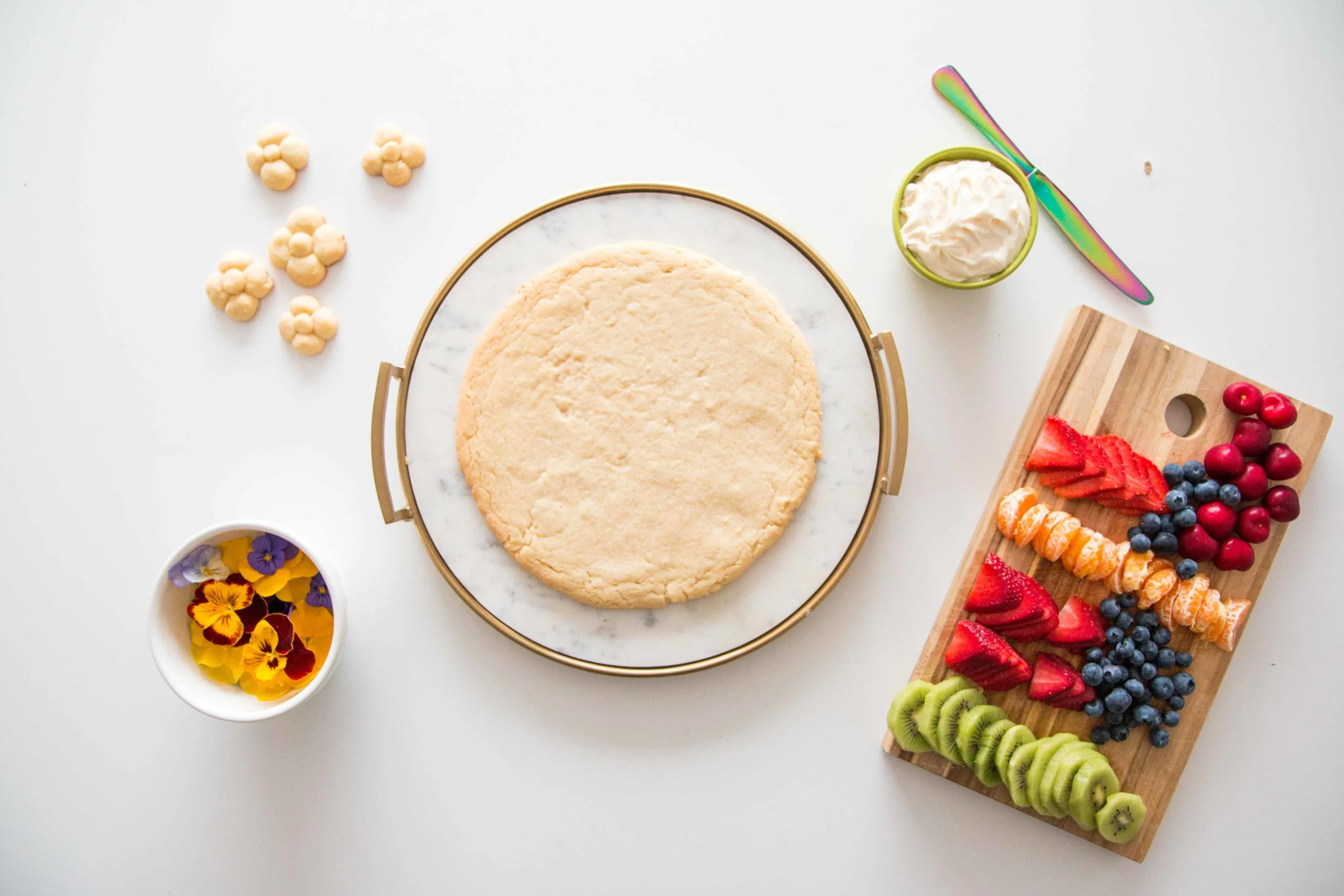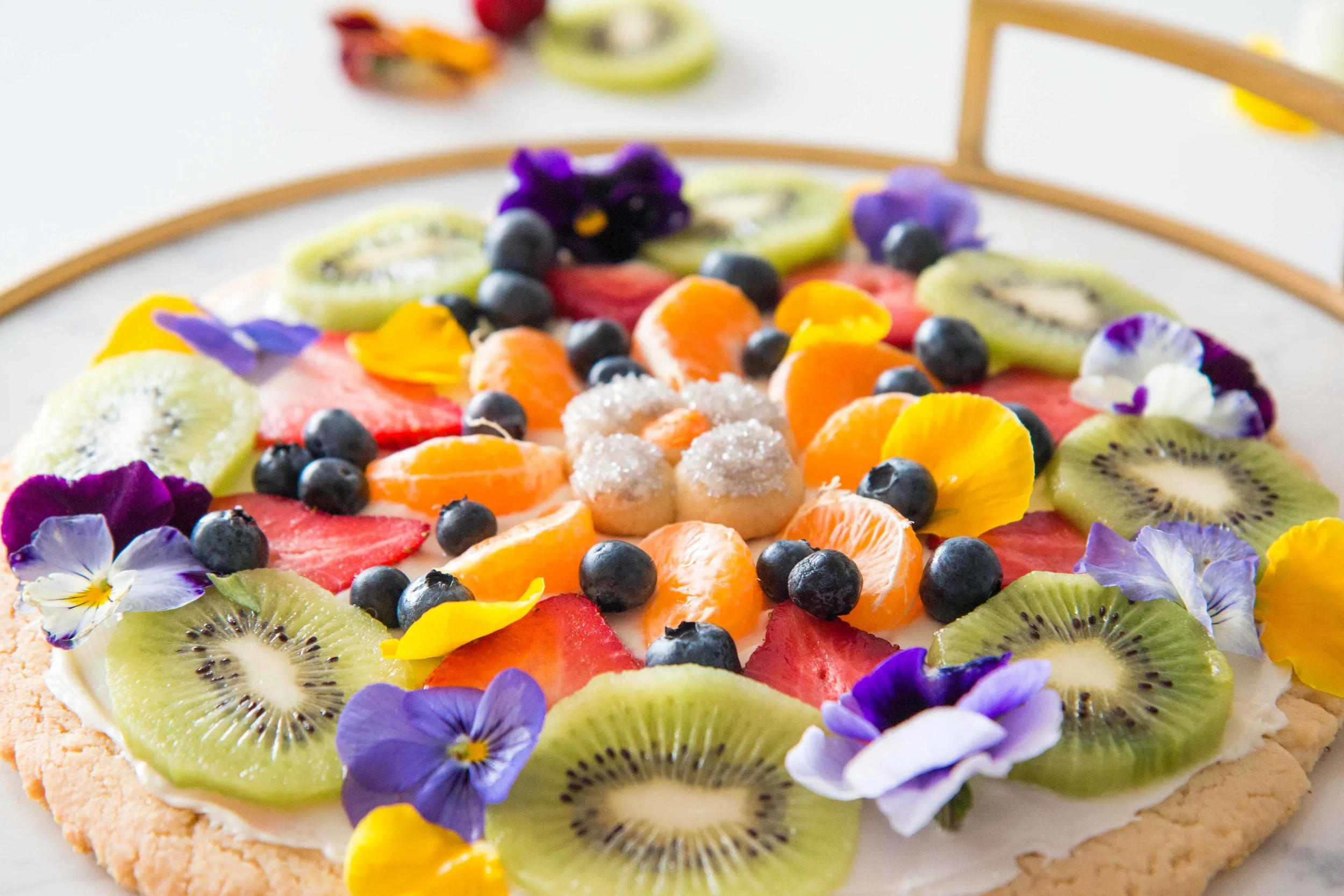 So we decided to take a sweet spin on your typical pizza party- literally. Dessert pizza?! I mean come on. It's so much prettier than regular pizza. It's delicious in a different way. And we're finally into the season where we can enjoy the prettiest fruits and flowers from the farmer's market.