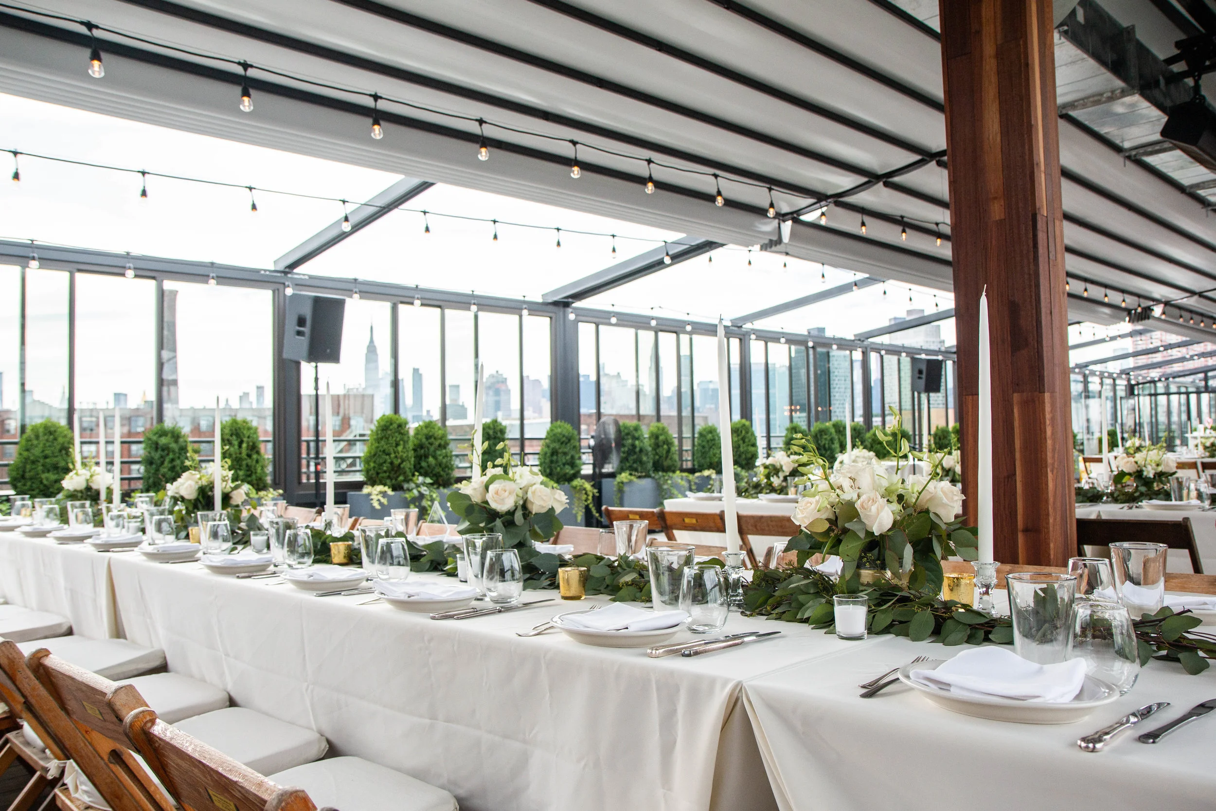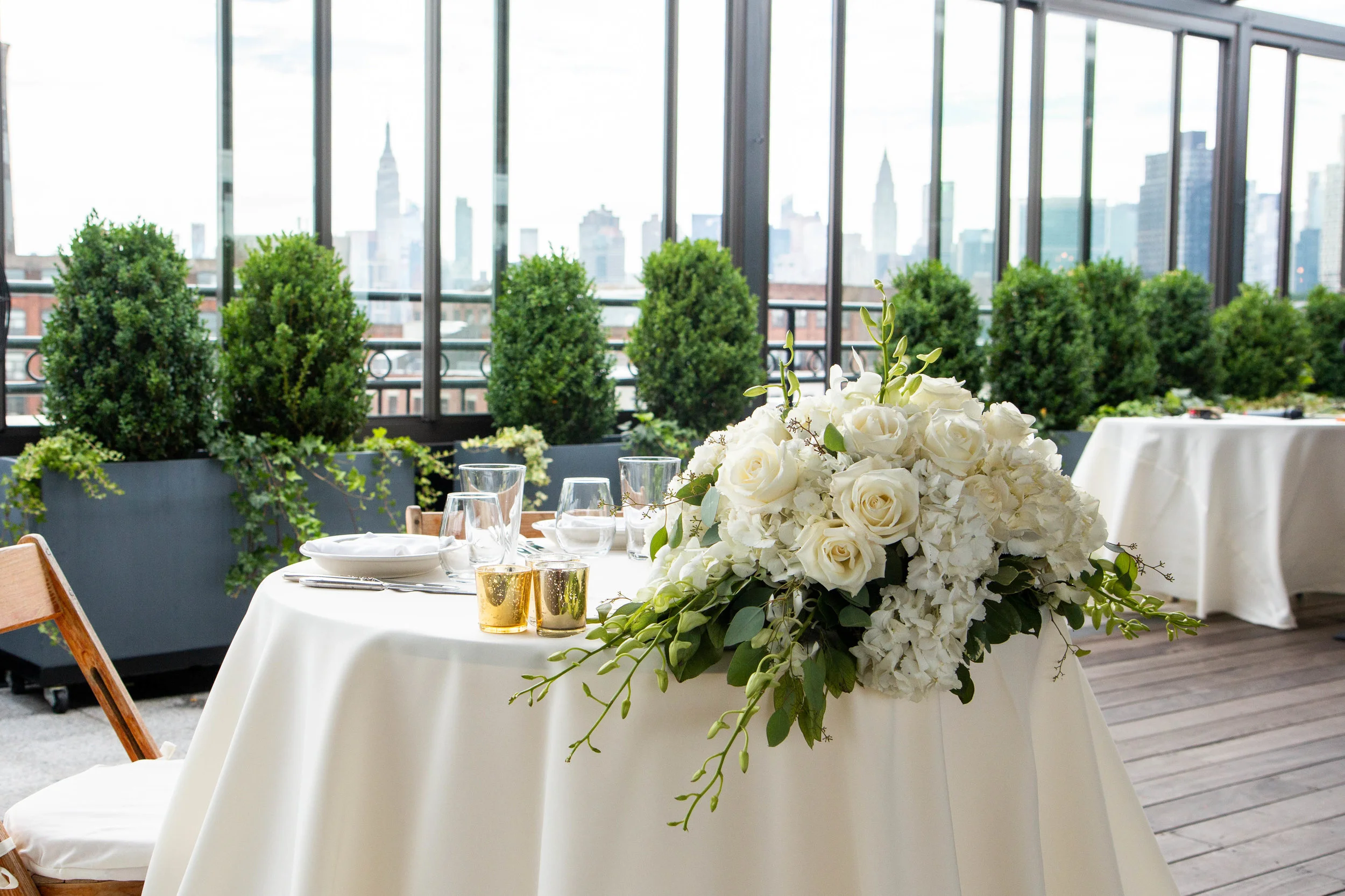 Kate and Luke chose The Box House Hotel rooftop in Brooklyn for their party, and the views were absolutely stunning. We were able to set up a little outdoor seating vignette, complete with our favorite furniture and glow balls from Taylor Creative.