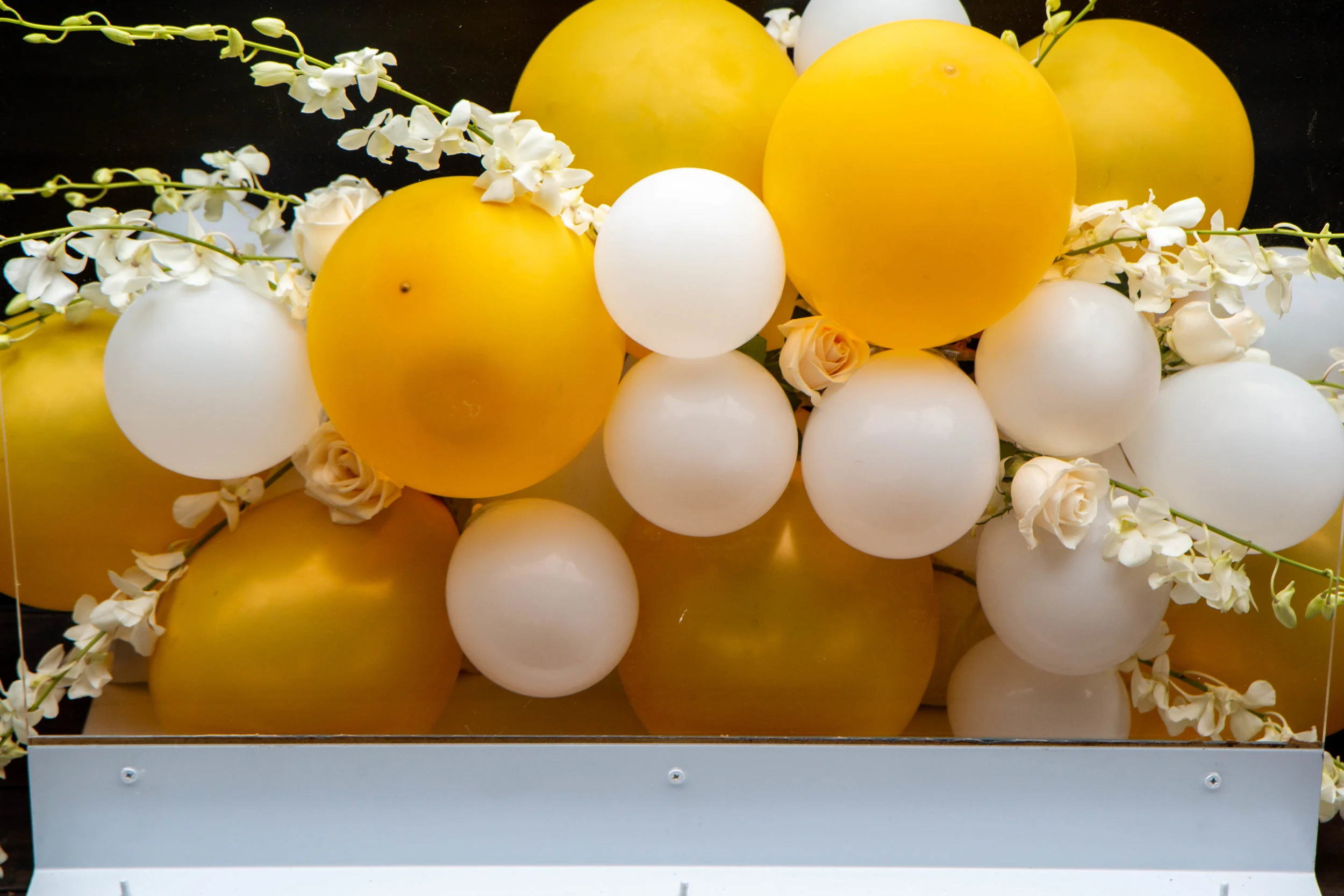 So the first decor item on our list was a balloon garland. These garlands are our newest favorite obsession because they create such a stunning backdrop for photos as well as a show-stopping decor item for everyone to enjoy. We worked with Kate's amazing florist, Columbia Florist, to provide us some extra stems to add into our garland, and they were the perfect touch.