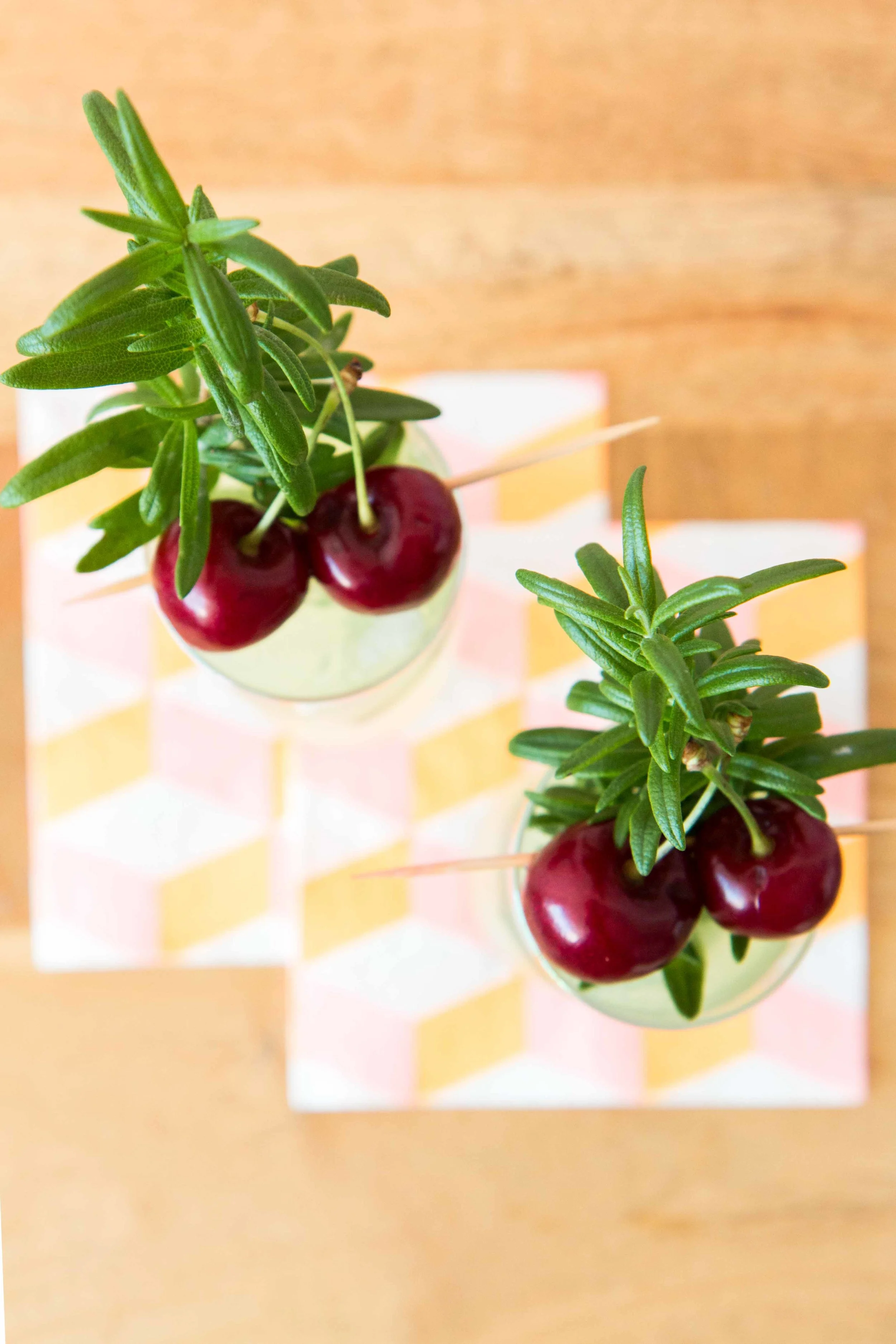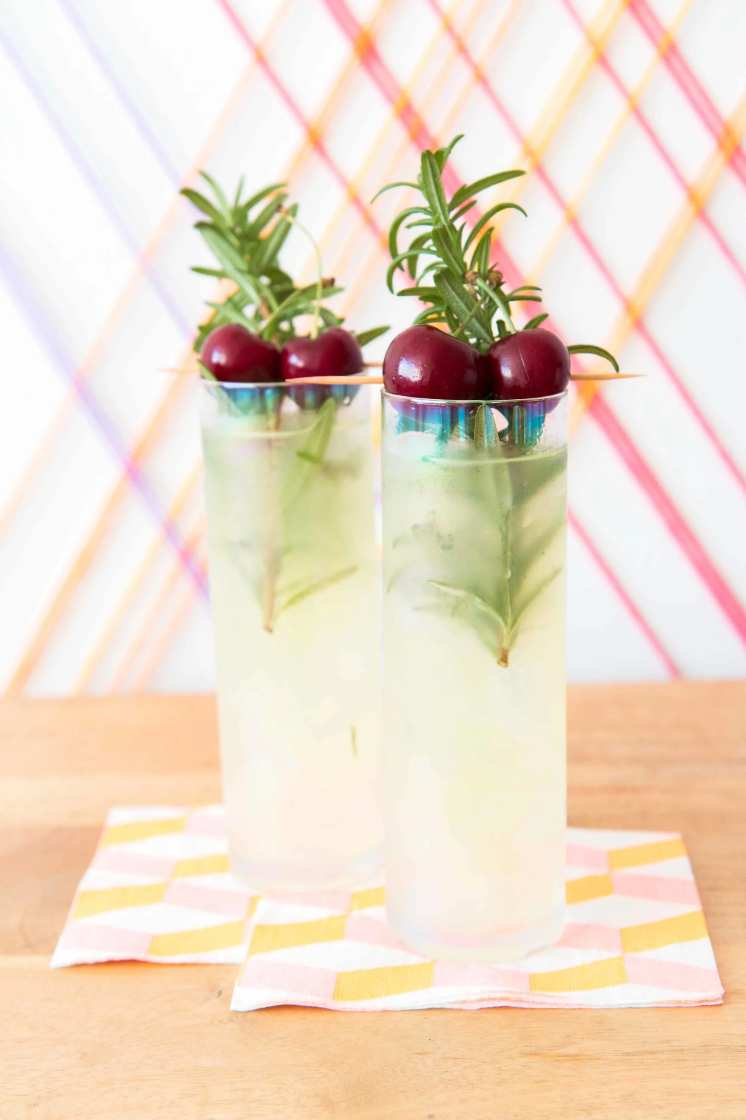 Shake up your lemonade and gin so it's evenly distributed, then top with a splash of soda for your "fizz." Add rosemary and cherries as you wish and that's IT. So easy, so refreshing, and perfect for a summer happy hour.