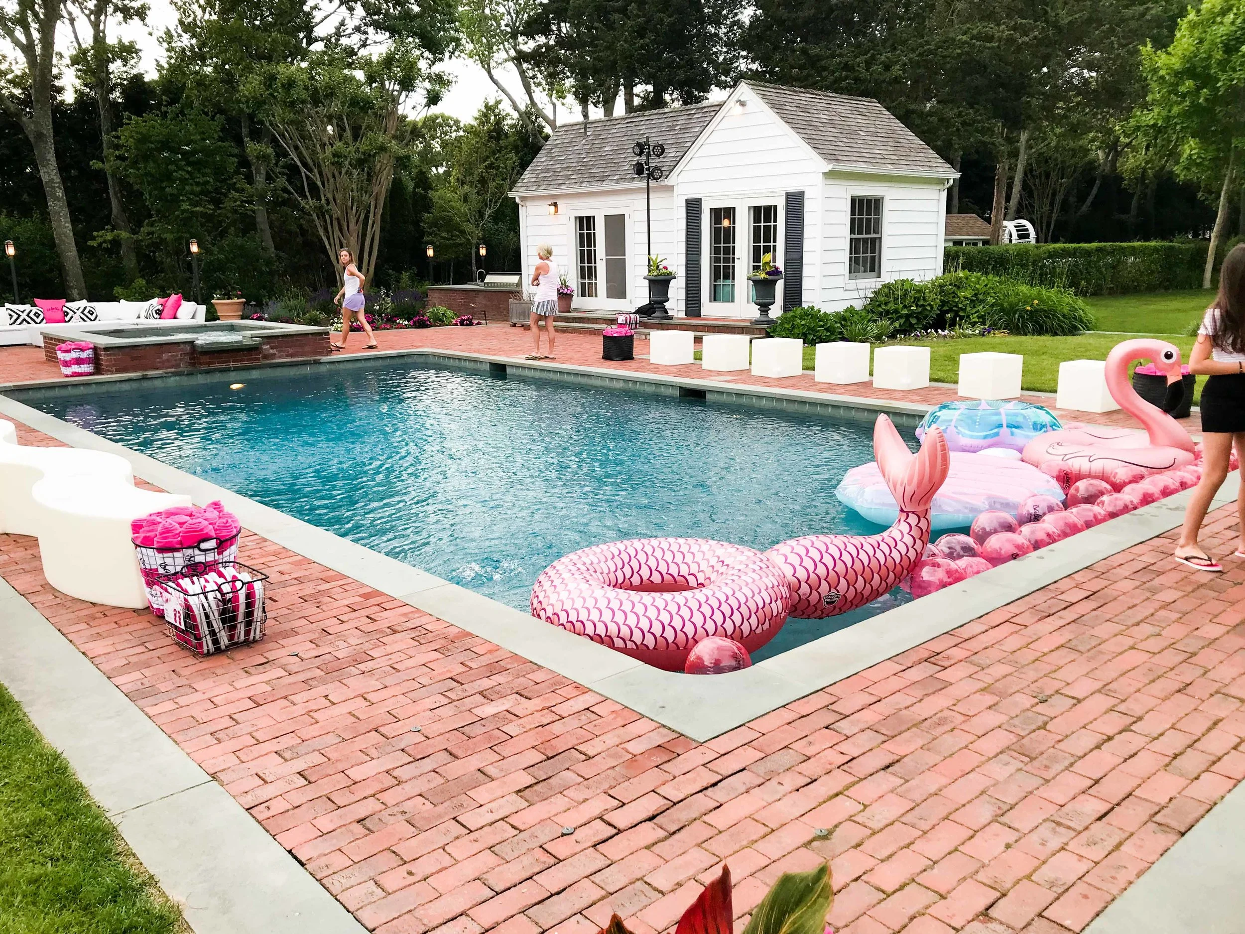 Oh by the way, did we mention this was also a POOL PARTY?! We filled the beautiful backyard oasis with customized "Isabella" beach balls, pool towels, and flip flops. We grabbed our favorite floats from Big Mouth, threw them in the pool, and they served as their own piece of fun decor.