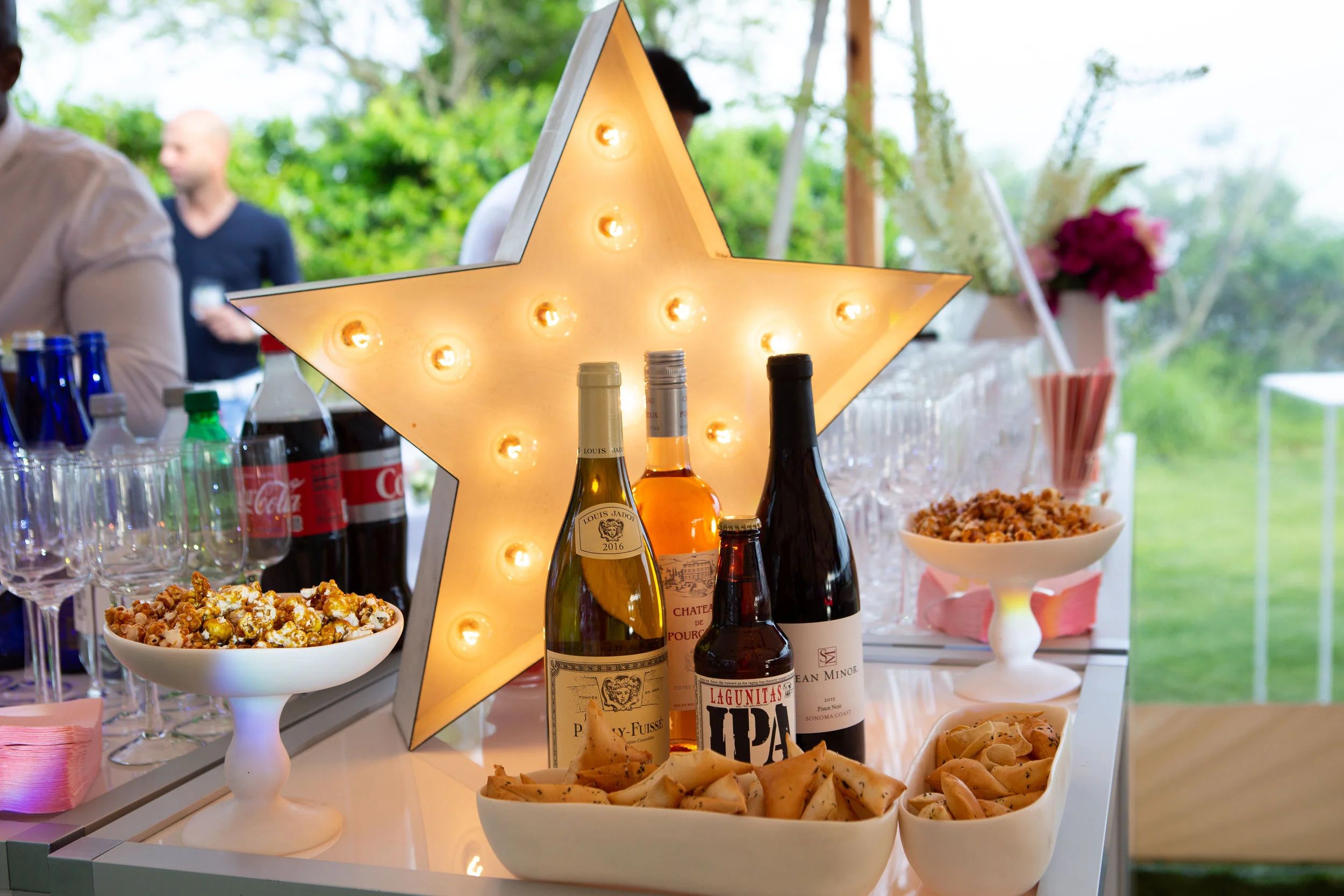 Of course, one of the most important parts of any party is the food and bar- so we tend to spend more time on this than you'd think. It's important to make it appealing as the guests will spend so much time there! We brought in one of our favorite and insanely unique caterers Pinch Food and Design. They served a variety of gorgeous and delicious foods including pretzels on an umbrella. We dolled up the bar with some stunning floral arrangements to flank the sides, added our favorite star marquee light and brought in pink metallic straws. We had customized gold foil "dance it out" cocktail napkins and a sign made especially with Isabella's signature drinks for the night.