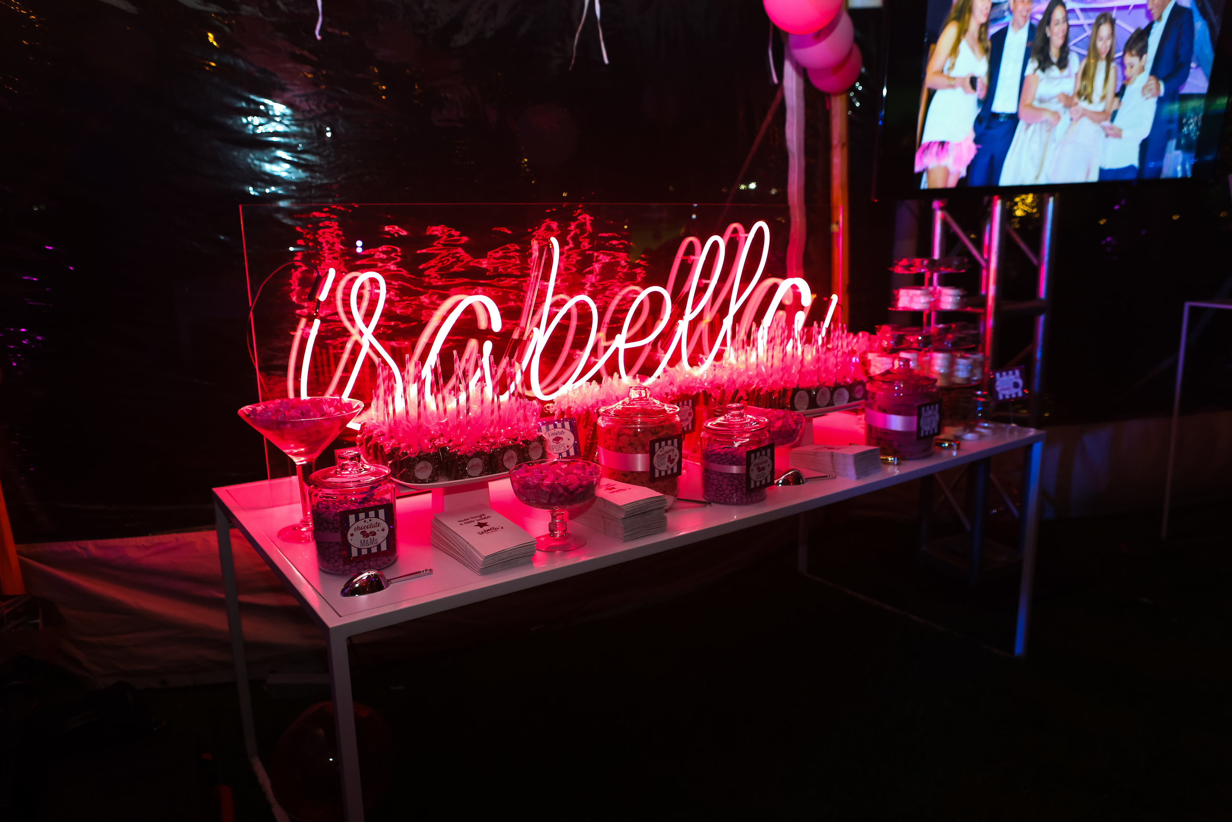 Last but not least, we finished up the night as anyone should- with an epic candy bar including Chocolate Marshmallow pops and other home made goodies by The Perfect Cupcake all served under the custom neon "Isabella" light we had Manhattan Neon make for the event. Everything was perfectly pink to fit in with the rest of the party, and everyone went wild for it.
