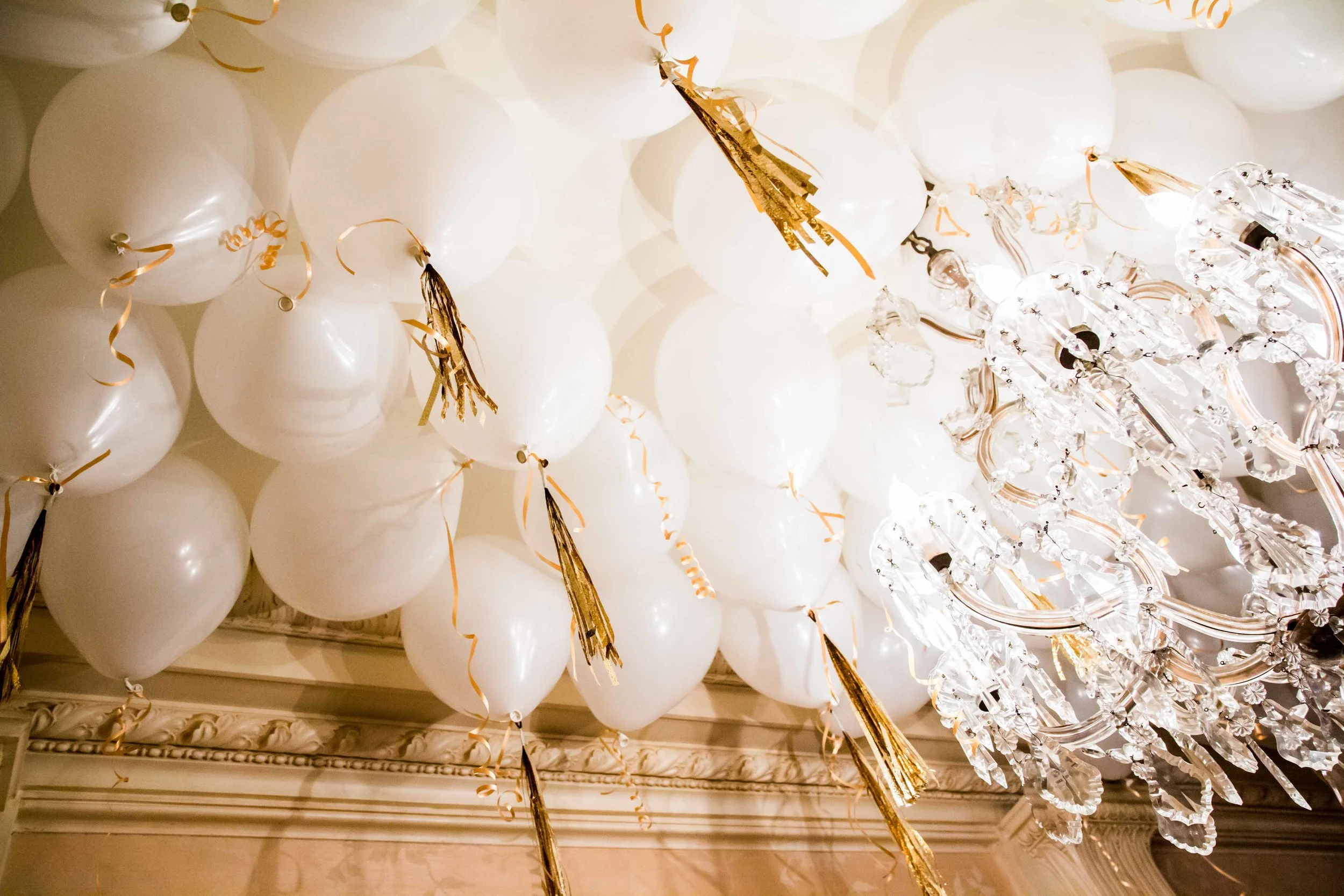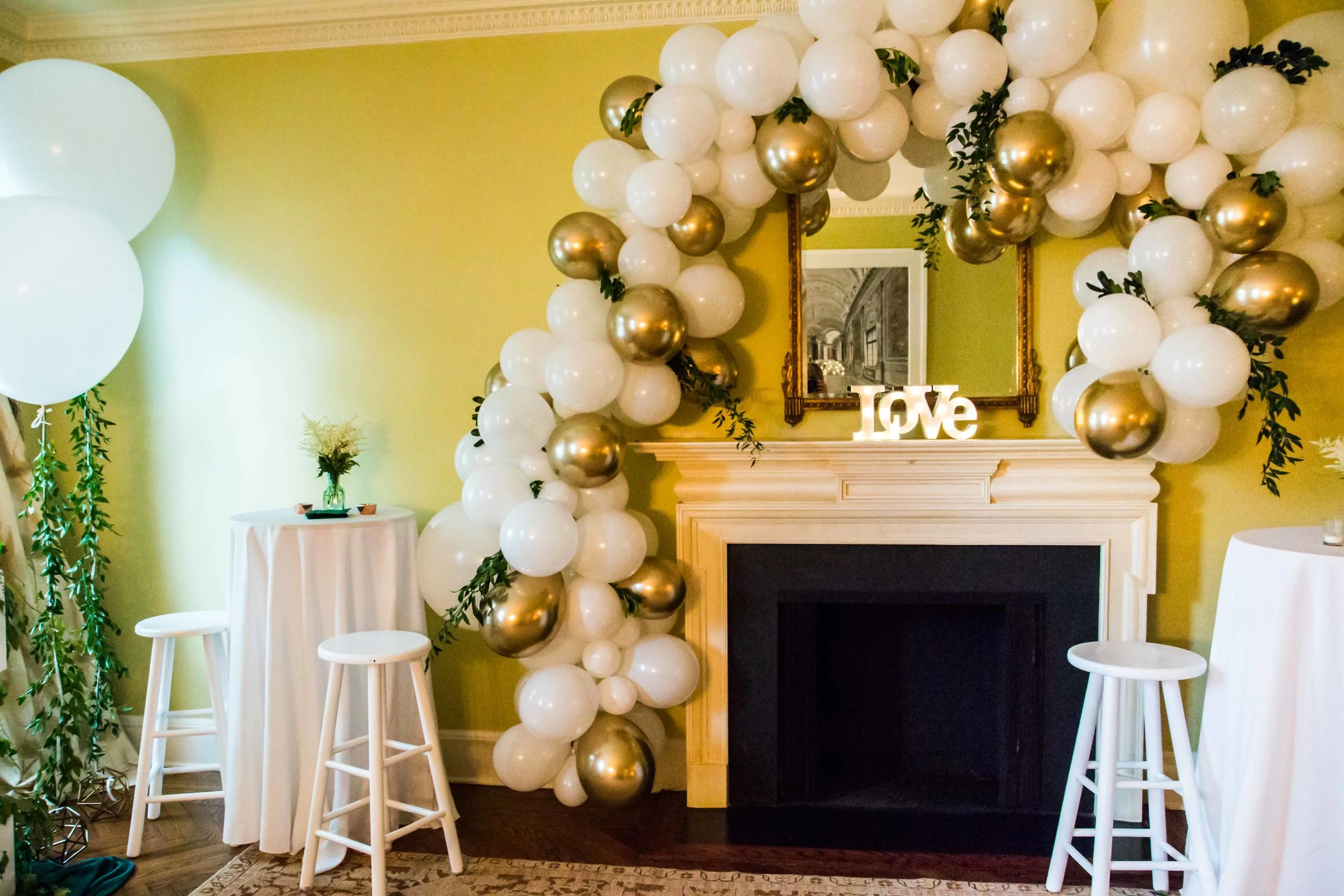 As if the 250 entryway balloons weren't enough, we also made a bubbly balloon garland. The chrome gold and white balloons mixed with the greenery made for a stunning arch over the fireplace. We also scattered jumbo balloons with greenery tails all over the space.