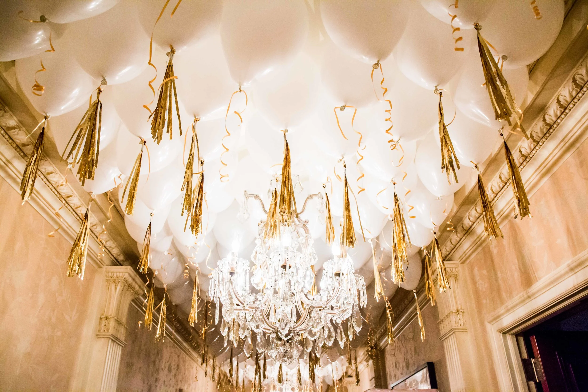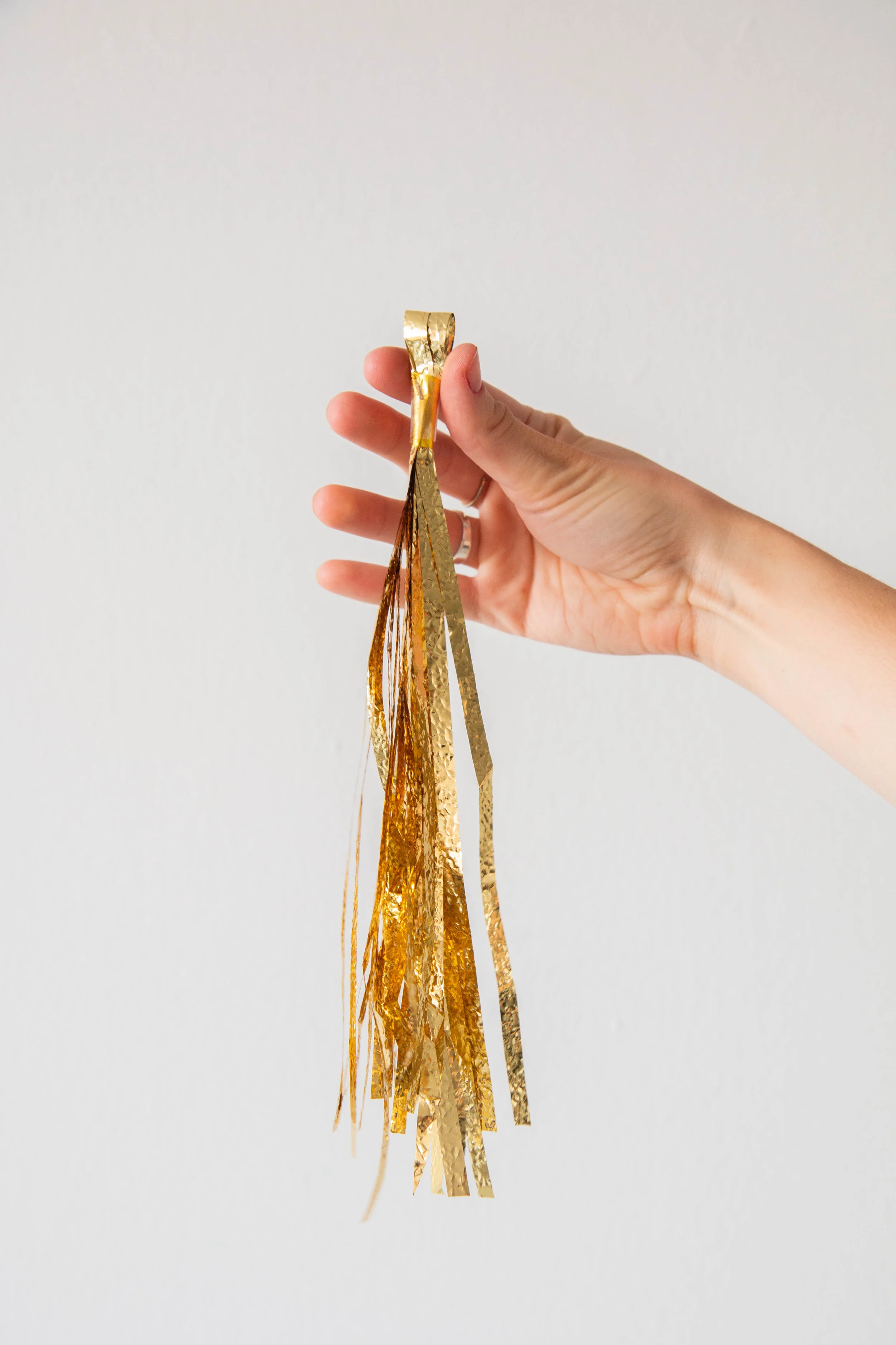 We recently styled an engagement party where we had the chance to go crazy with swoon-worthy decor, including an entryway ceiling filled with balloons and gold tassels. So what else would "Crafty Maggie" suggest than to make the tassels ourselves?! Luckily, we had a huge gold fringe backdrop laying around our office from Decorative Novelty so we figured WHY NOT.