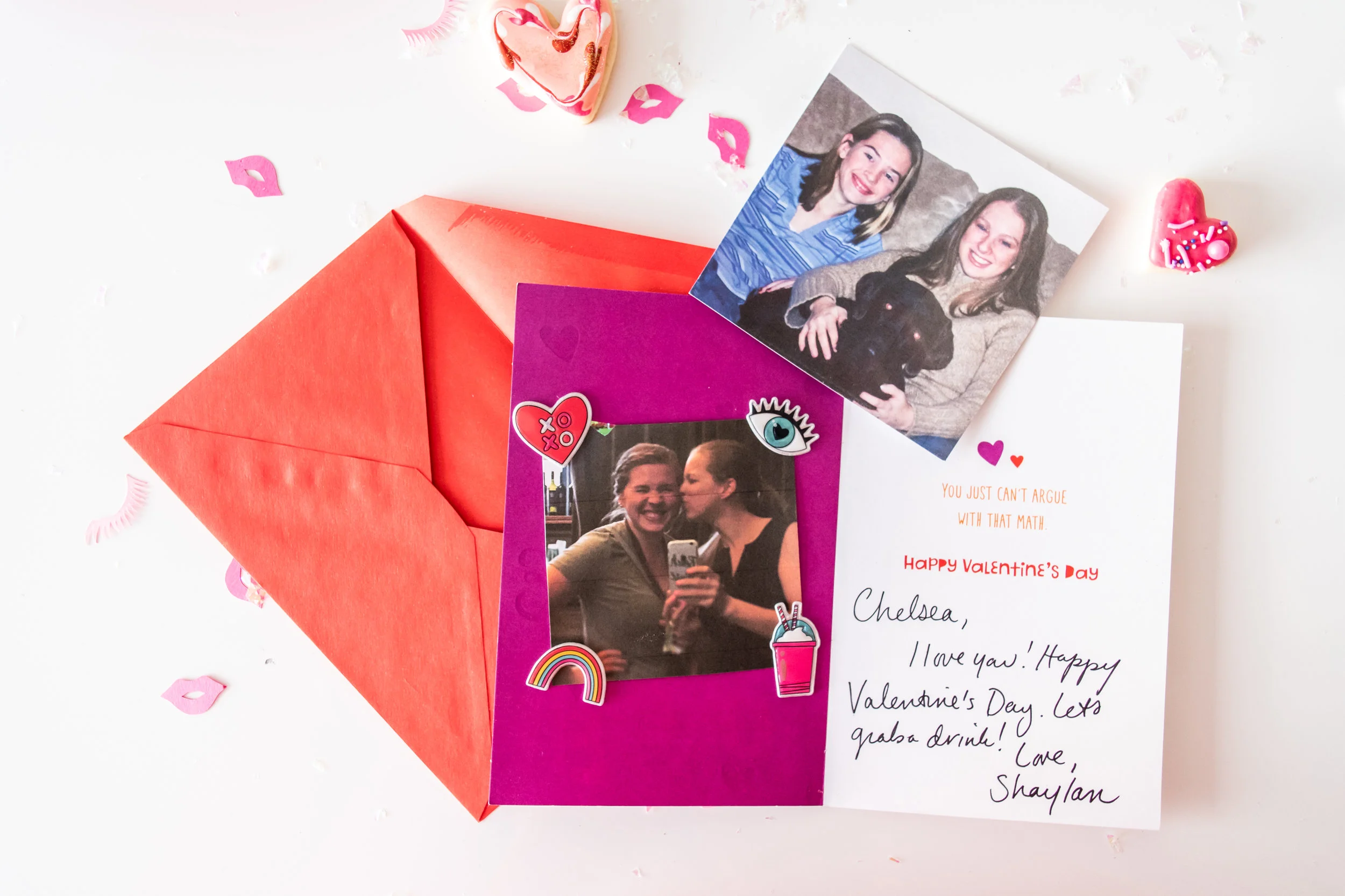 Since our entire Little Miss Party squad has sisters, I thought it would be a nice touch to print out photos of all our sister duos. The girls used the photos in their cards as a special surprise to their favorite Galentine. I attached my photos with the festive heart stickers that I also found in the American Greetings card section at Target.