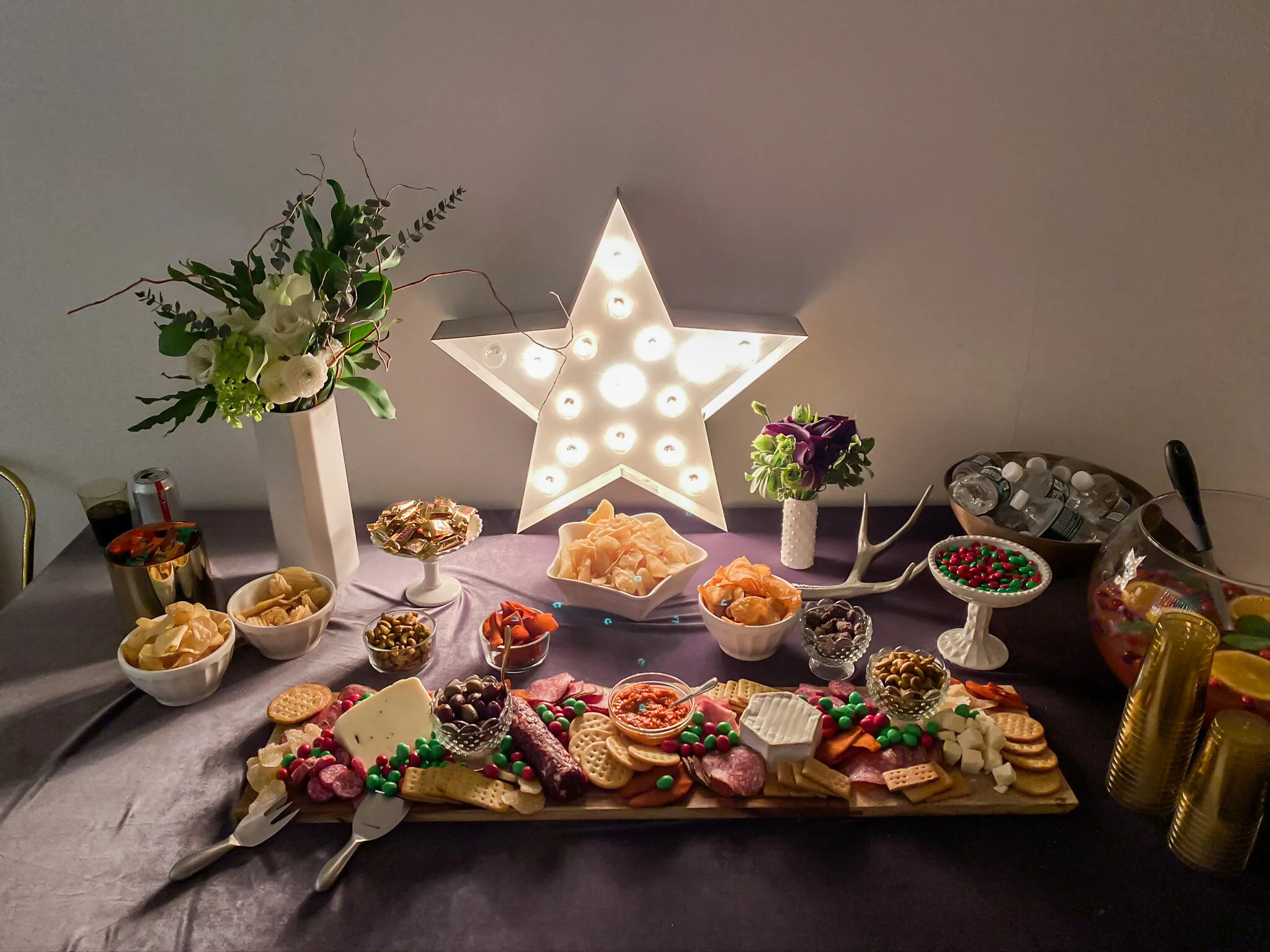 And finally- what the day was leading up to. The party! A couple days in advance, I decorated the ceiling with garlands, ribbons, and steamers creating a dramatic effect across the whole room. I added a small disco ball on a command hook, and we were good to go! As per usual, Seri found the best ingredients for a killer charcuterie board, which she sprinkled with red and green M&Ms for a festive look. We filled every last gap with our favorite flavors of Kettle Brand chips as well, which are always such a hit. Shaylan made an amazing punch, we loaded up the bar cart, and got right to the party!