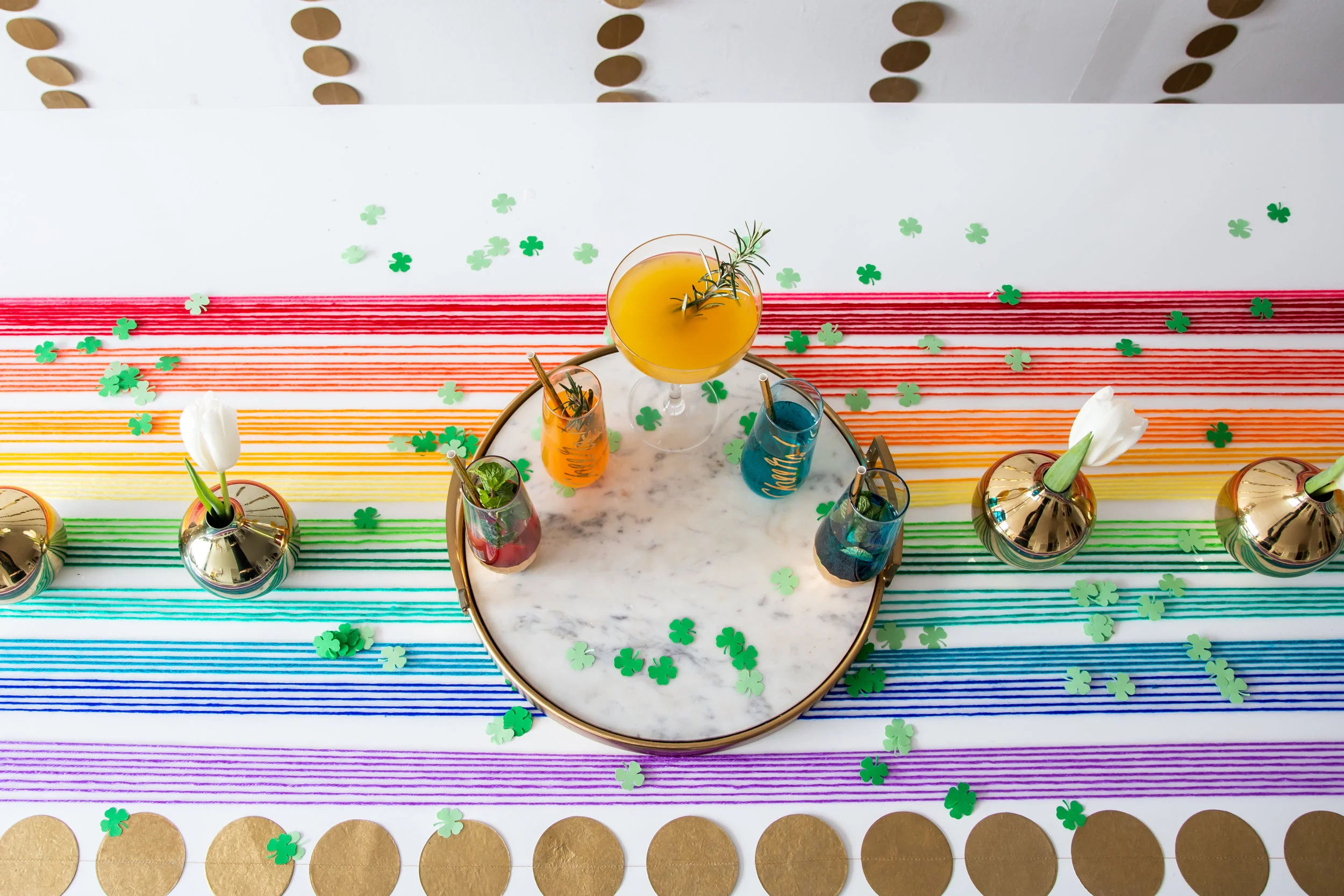 I wanted to create a cocktail party table that was easy, quick, and using items we already had in the office. I used tons of colorful yarn we had leftover from an event to create a rainbow yarn runner. All you need is yarn, tape, and scissors. Seriously, that’s it! Just line your strands of yarn in stripes and tape them under the table to achieve this look. We also had a little four leaf clover hole punch which I used to punch confetti for the table. I pulled out some gold paper garlands from Minted and hung them up as a wall decoration- they look just like a leprechaun’s gold coins! If you don’t have the time to order these, they would be easy to achieve with an oversized circle punch and gold paper from your local craft store!