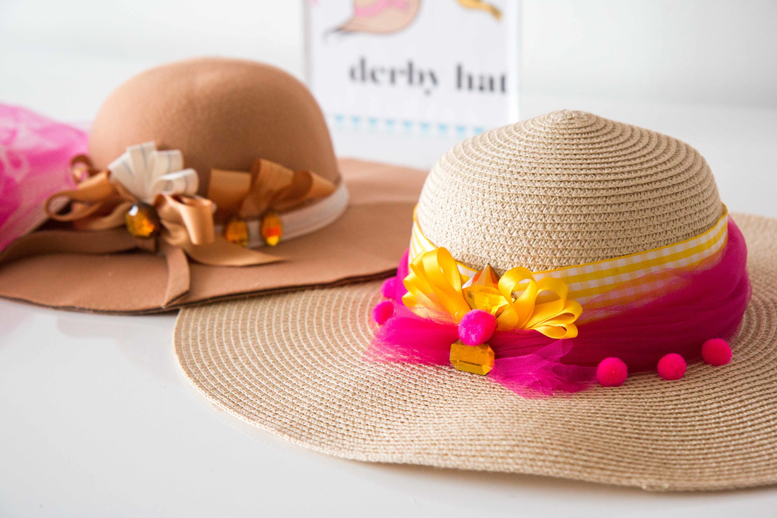 Head to your local craft store for fun ribbons, tulle, craft jewels, and anything else you’d like on your hat! Fake flowers and feathers are also a crowd favorite.