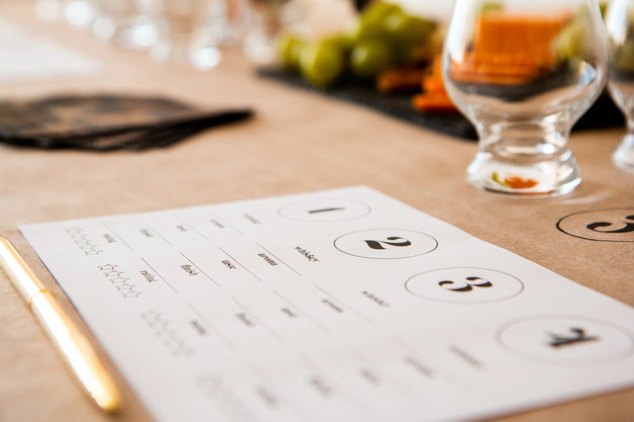 The best part about a little celebration like this one is that you can make it at home and have each guest bring the type of whiskey they want everyone to try. You just lay out some paper on the table and label each bottle. We used kraft, but you could even use something as accessible as a plain wrapping paper!