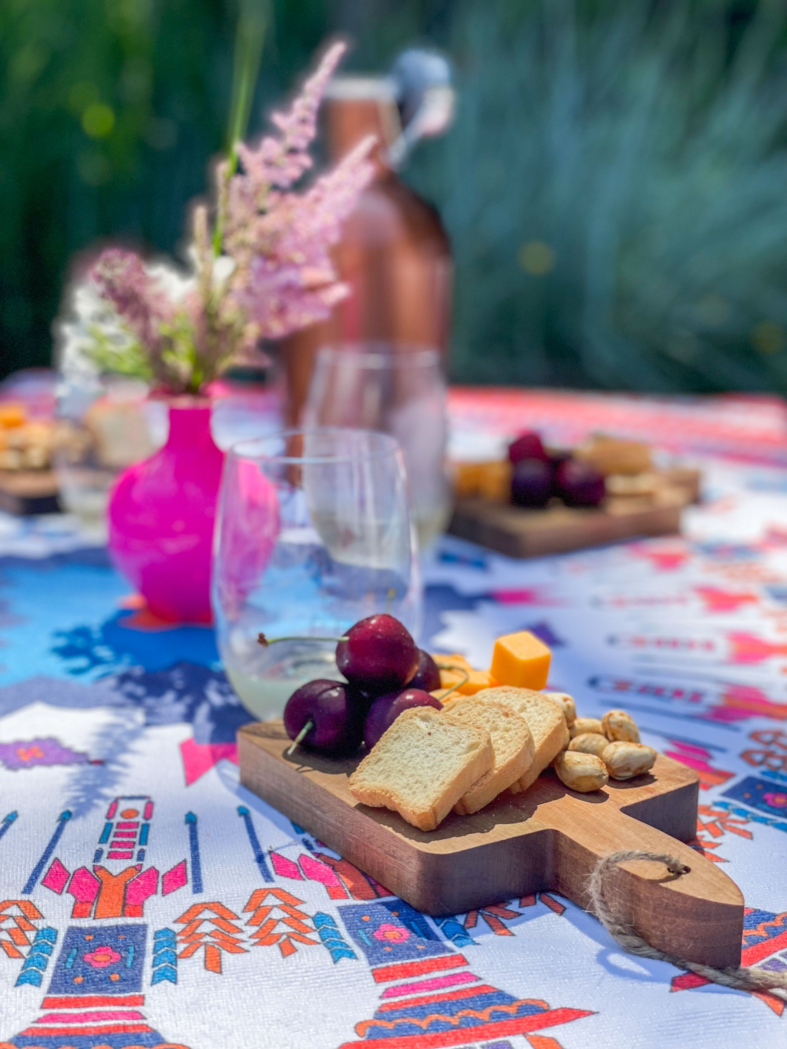 Today, I have friends coming over for cocktails so I set up a “picnic” for us to enjoy in my outdoor lounge. I covered the coffee table with a round beach blanket and I set out mini cutting boards that my friend Lisa had gifted me with charcuterie and cheese.