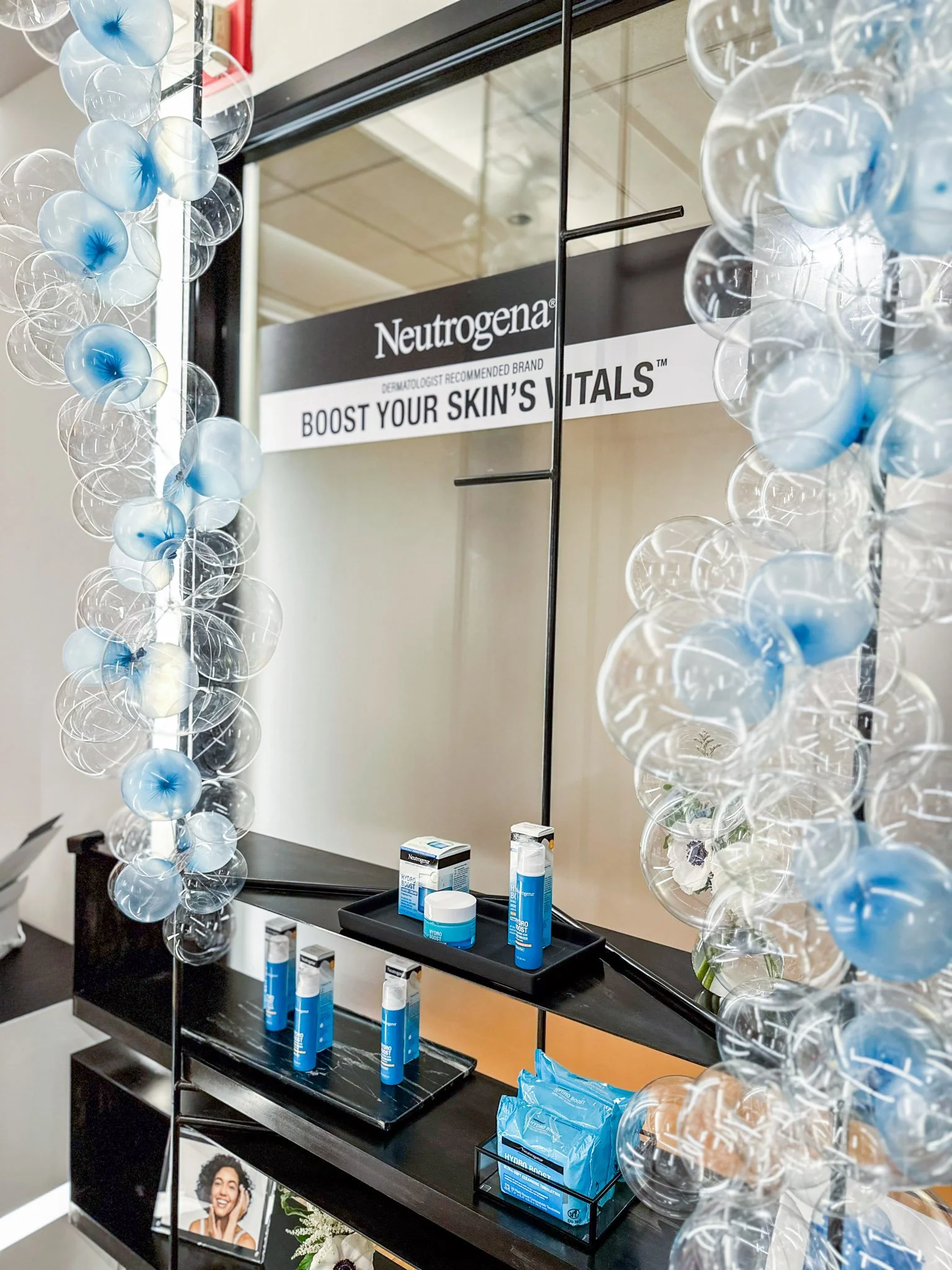 During this event, the guests were able to enjoy a session in a treatment room with the Neutrogena products. This was a fantastic way for the guests to get a feel for the product that the brand was highlighting. We styled florals and product throughout the rooms to pull the branding through.