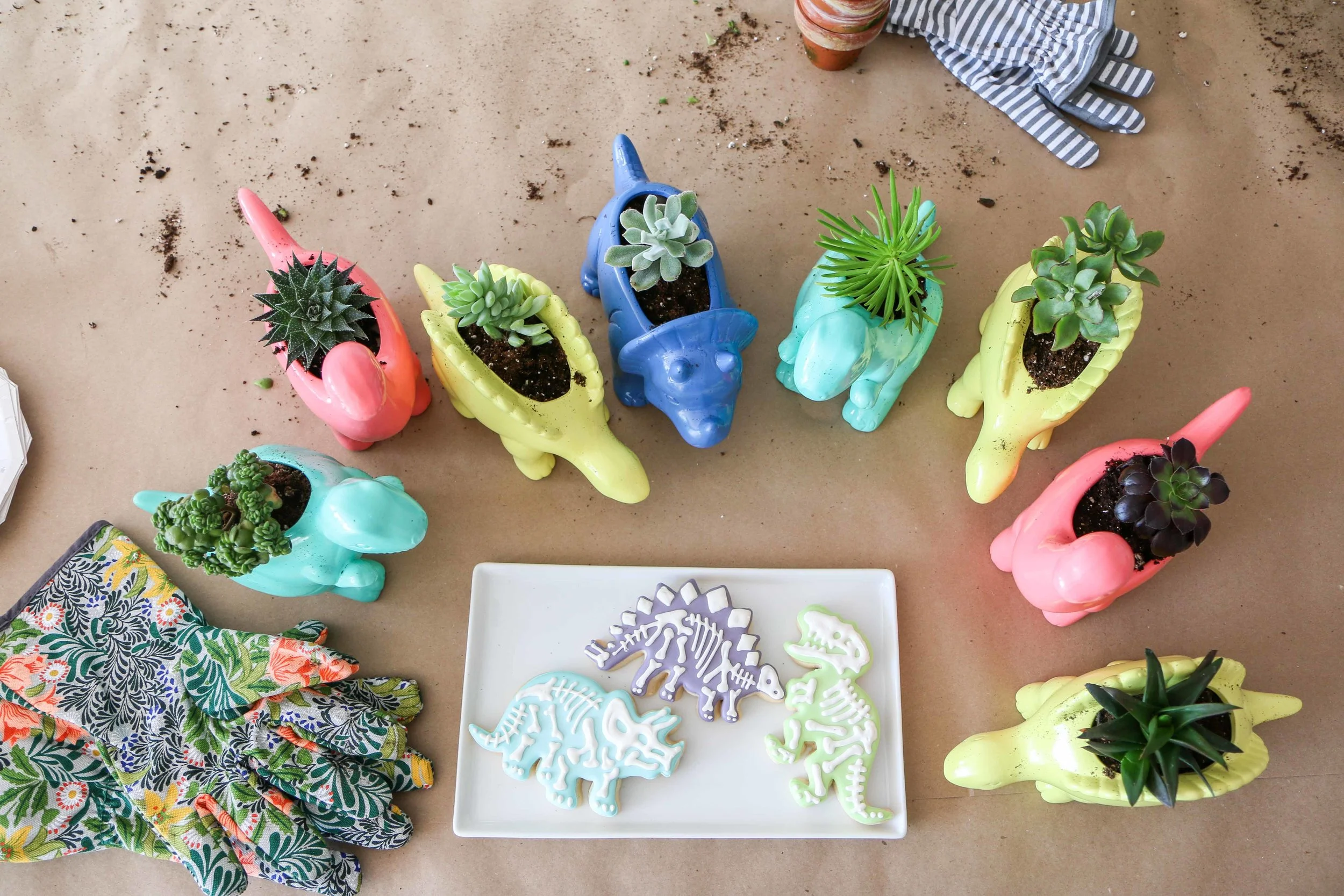 The kids had a blast with this project and now each have a dino planter on their desk that they care for by watering daily. With the leftover plants we set a tablescape and later this week we’ll be gifting a dino plant to each of the kids teacher’s for Teacher’s Appreciation.