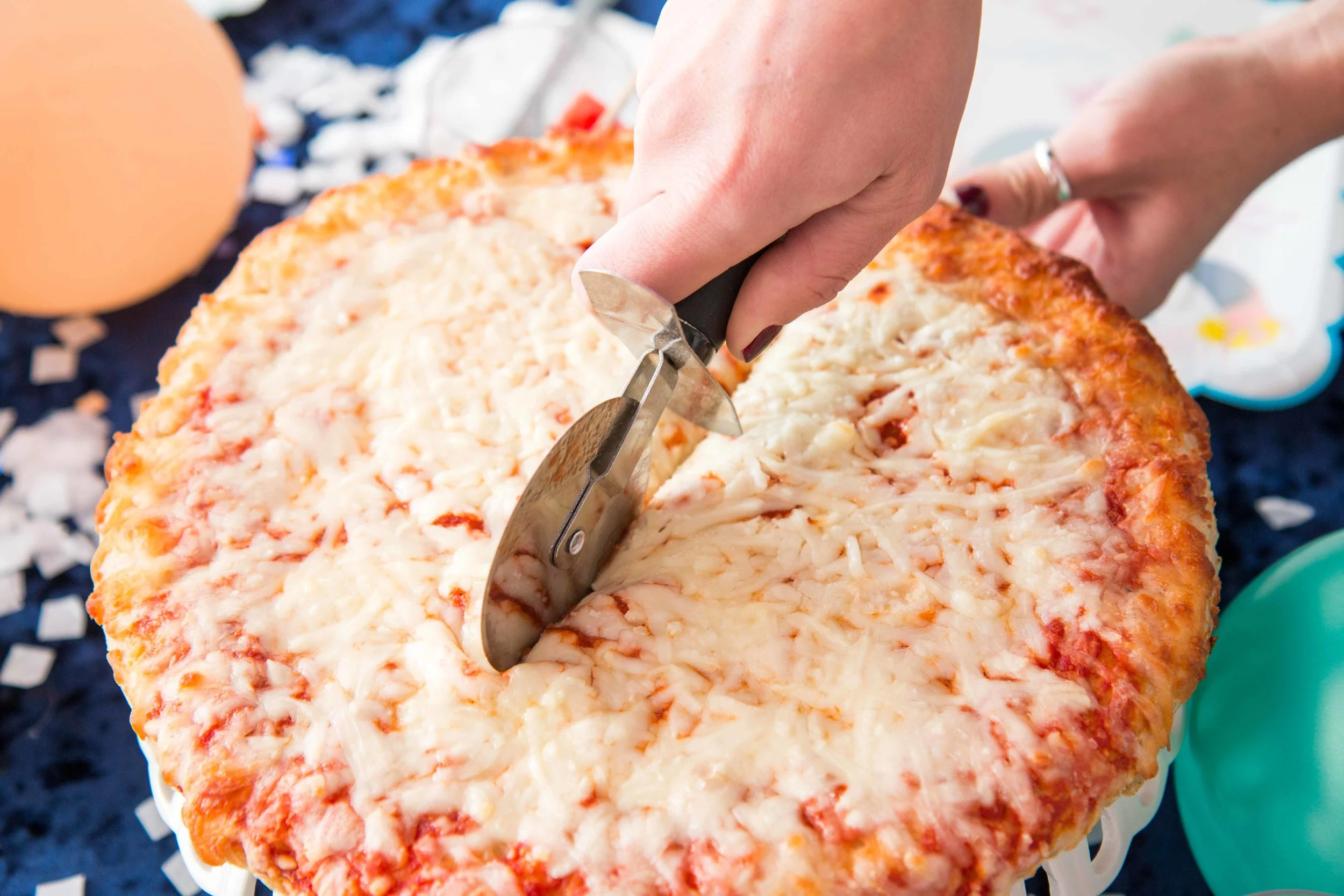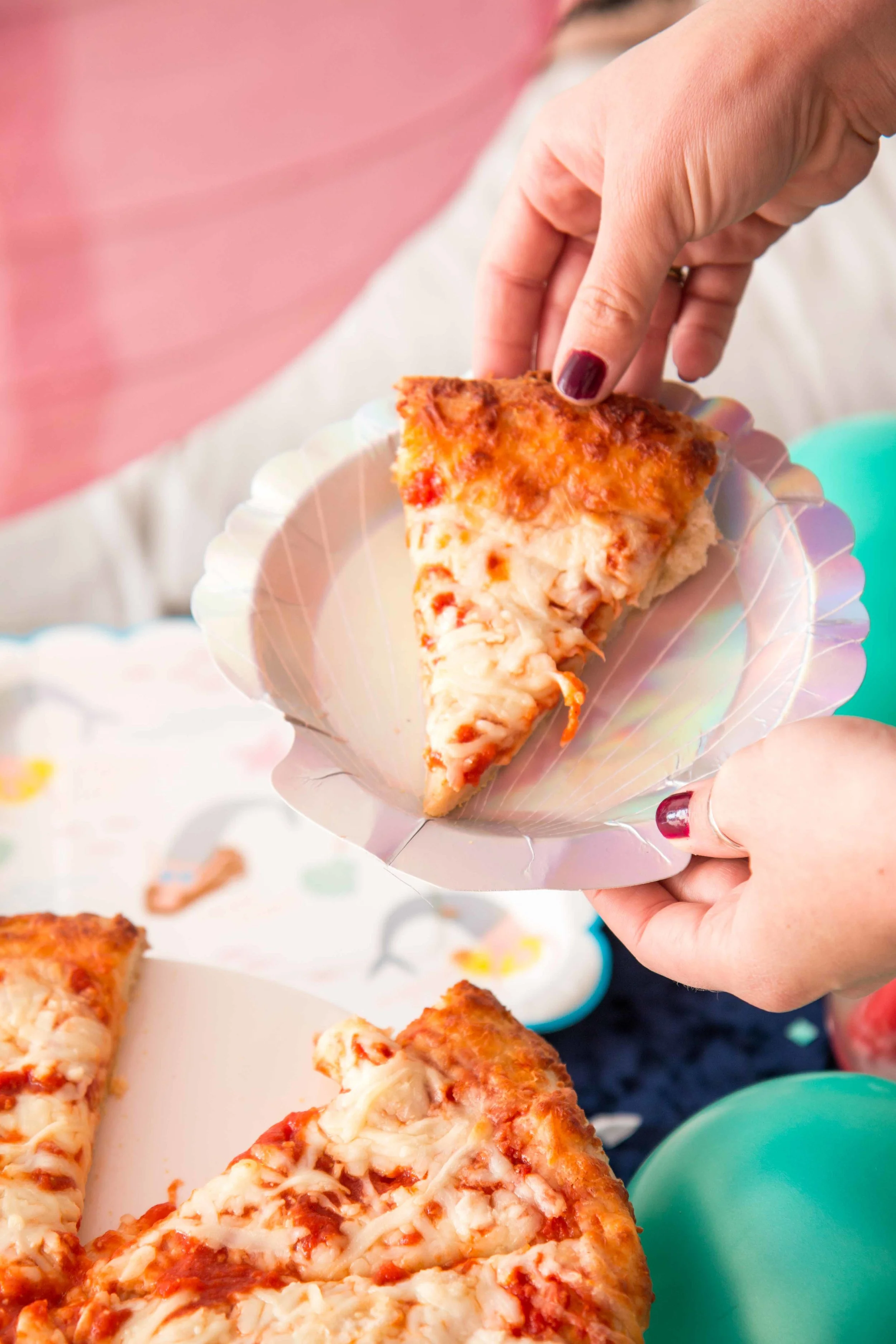 Come the day of the play date, we set up the decor and tableware just the way we planned it for our client’s custom box. We baked our Stuffed Crust Five Cheese Pizza in a matter of minutes and then placed it on a white cake stand to present it in a fun way that would match our decor.