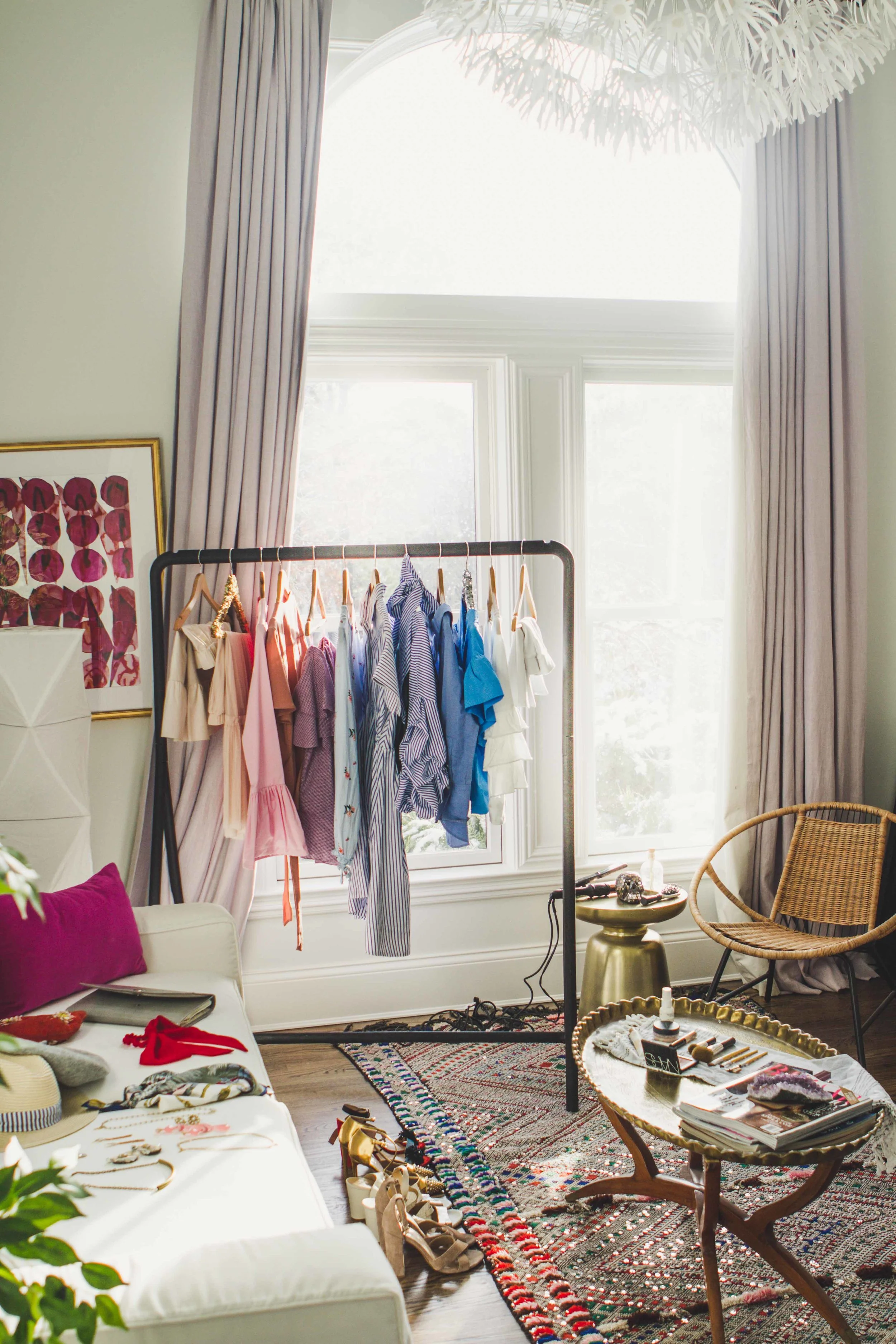 One of our recent shoots for Lillet, I took extra photos of our setup behind the scenes so we could share how we truly transformed our space and took care in the detail of our outfit choices. I set up the dressing room with all the outfits I had hand-picked in advance alongside various accessories, hair styling tools, and our makeup station. I went shopping for spring outfits at H & M, Forever 21 and even in Seri's closet. We never feel as though we need to spend a lot of money to make these photos look amazing. We work with basic items that are easy to mix and match. I chose clothes to fit all of our body types so everyone would have a choice of what to wear that would make them feel most comfortable while still restricting us to a color scheme that would work best for the photos.