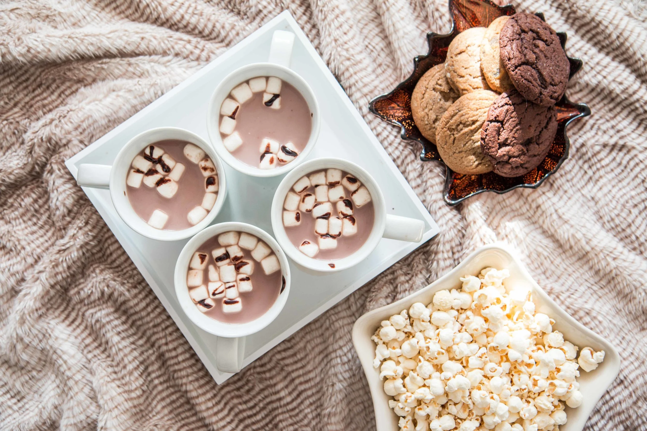 Once we exchanged our thoughtful, personalized gift boxes, we relaxed in our cozy sweaters amongst a bunch of fuzzy blankets and pillows. We sipped hot cocoa and munched on popcorn underneath this fabulous “Merry” garland, which Maggie DIY-ed with faux evergreen garland, wire and twinkle lights.