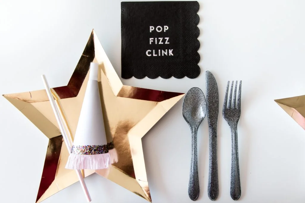 We also included festive blow horns so you can toot a horn come midnight. I’m so lovin’ the star plates that we included in this box that are disposable for an easy clean up at the end of the night.