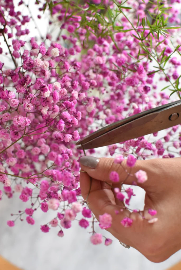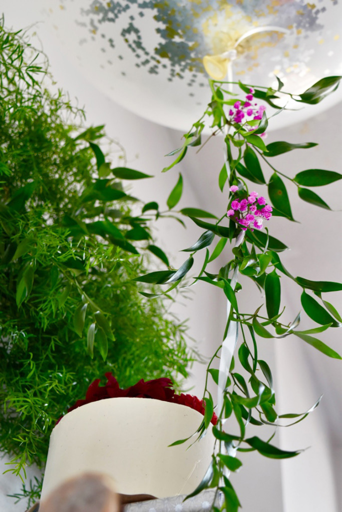 What you'll need : * One jumbo balloon (36"). We used a confetti filled balloon. * Jumbo Balloon Time Helium Tank * fresh greenery * lightweight flowers - we used baby's breath * string or ribbon