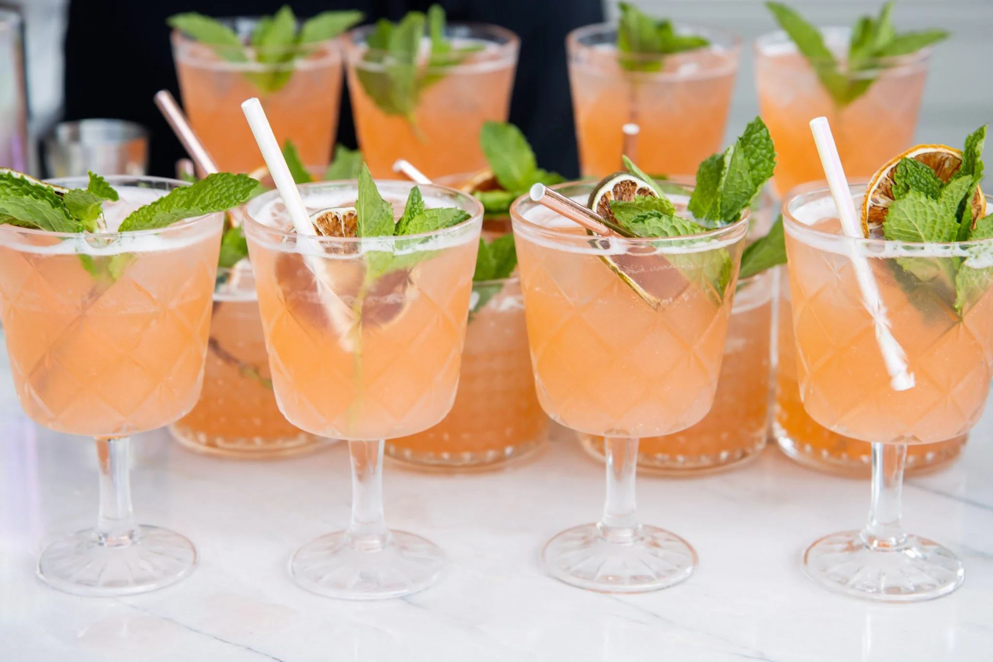 Recommended garnishes: mint sprig, dehydrated citrus, freeze dried or fresh sliced strawberries